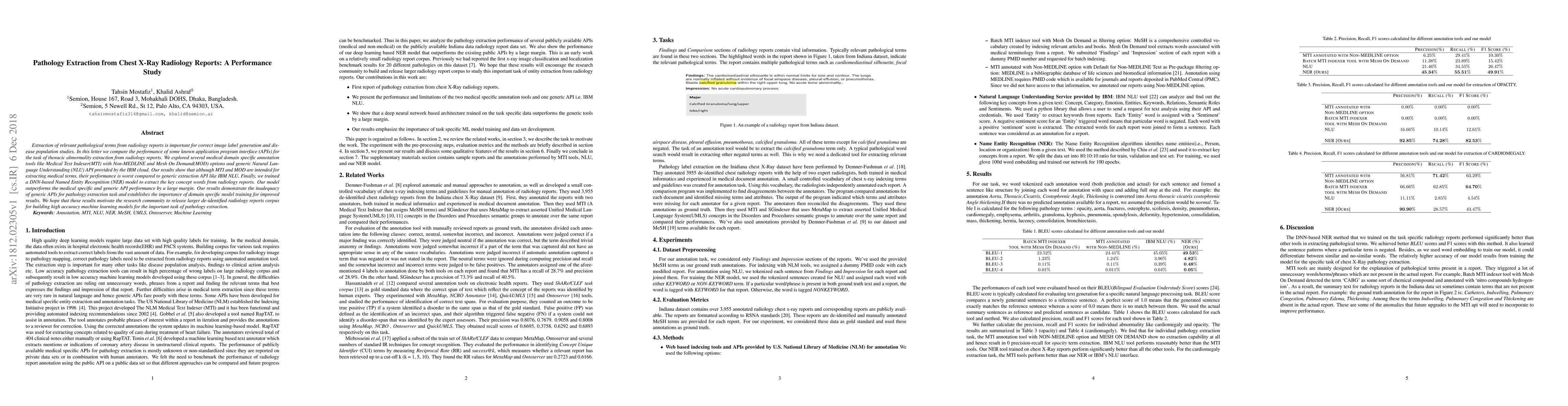 Extraction of relevant pathological terms from radiology reports is important for correct image label generation and disease population studies. In this letter, we compare the performance of some known application program interface (APIs) for the task of thoracic abnormality extraction from radiology reports. We explored several medical domain specific annotation tools like Medical Text Indexer(MTI) with Non-MEDLINE and Mesh On Demand(MOD) options and generic Natural Language Understanding (NLU) API provided by the IBM cloud. Our results show that although MTI and MOD are intended for extracting medical terms, their performance is worst compared to generic extraction API like IBM NLU. Finally, we trained a DNN-based Named Entity Recognition (NER) model to extract the key concept words from radiology reports. Our model outperforms the medical specific and generic API performance by a large margin. Our results demonstrate the inadequacy of generic APIs for pathology extraction task and establish the importance of domain specific model training for improved results. We hope that these results motivate the research community to release larger de-identified radiology reports corpus for building high accuracy machine learning models for the important task of pathology extraction.