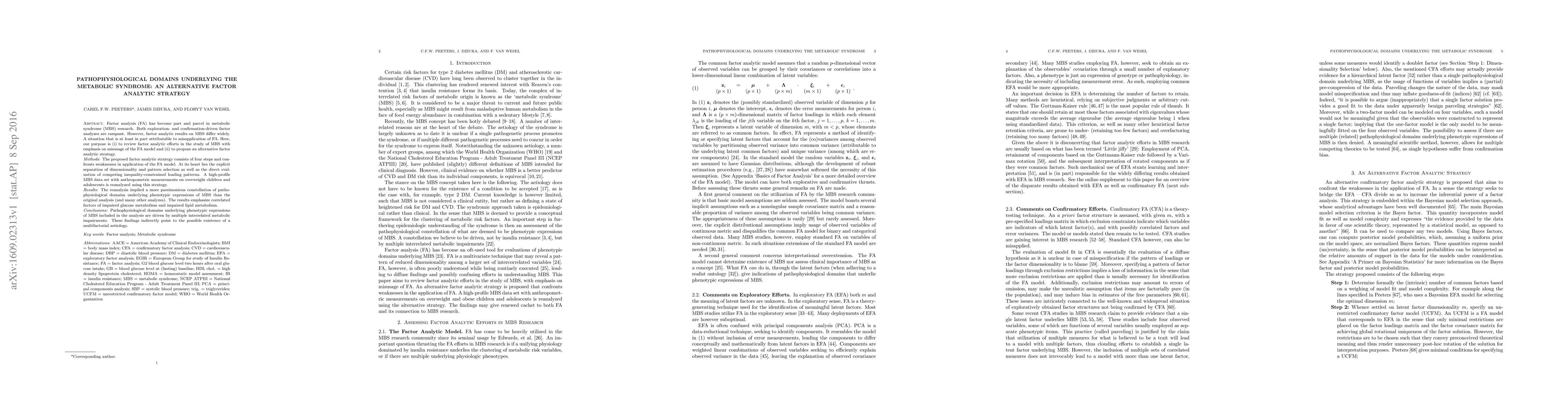 Purpose: Factor analysis (FA) has become part and parcel in metabolic syndrome (MBS) research. Both exploration- and confirmation-driven factor analyzes are rampant. However, factor analytic results on MBS differ widely. A situation that is at least in part attributable to misapplication of FA. Here, our purpose is (i) to review factor analytic efforts in the study of MBS with emphasis on misusage of the FA model and (ii) to propose an alternative factor analytic strategy. Methods: The proposed factor analytic strategy consists of four steps and confronts weaknesses in application of the FA model. At its heart lies the explicit separation of dimensionality and pattern selection as well as the direct evaluation of competing inequality-constrained loading patterns. A high-profile MBS data set with anthropometric measurements on overweight children and adolescents is reanalyzed using this strategy. Results: The reanalysis implied a more parsimonious constellation of pathophysiological domains underlying phenotypic expressions of MBS than the original analysis (and many other analyzes). The results emphasize correlated factors of impaired glucose metabolism and impaired lipid metabolism. Conclusions: Pathophysiological domains underlying phenotypic expressions of MBS included in the analysis are driven by multiple interrelated metabolic impairments. These findings indirectly point to the possible existence of a multifactorial aetiology.