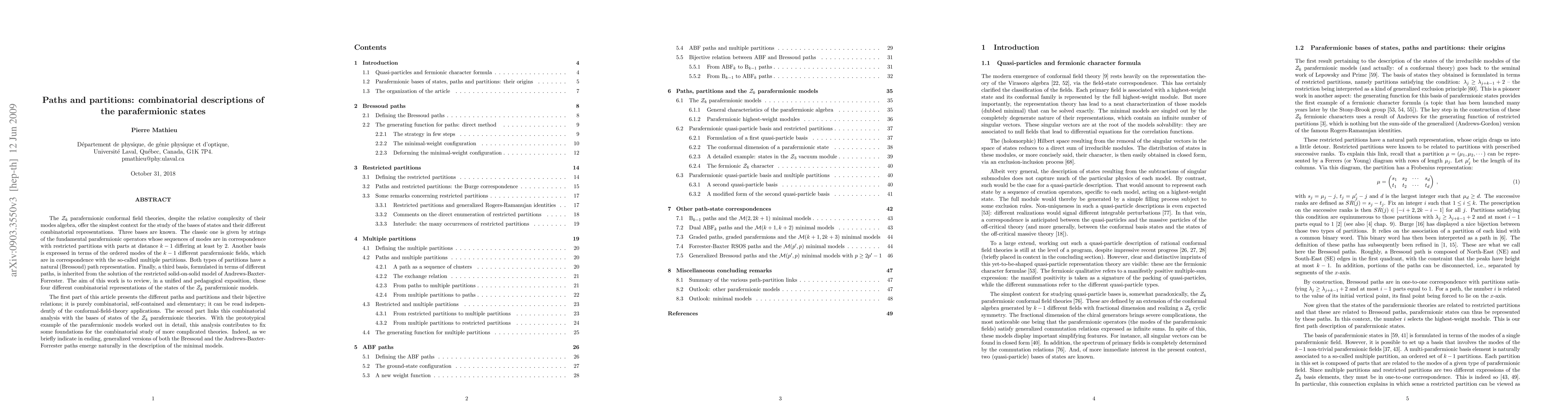 The Z_k parafermionic conformal field theories, despite the relative complexity of their modes algebra, offer the simplest context for the study of the bases of states and their different combinatorial representations. Three bases are known. The classic one is given by strings of the fundamental parafermionic operators whose sequences of modes are in correspondence with restricted partitions with parts at distance k-1 differing at least by 2. Another basis is expressed in terms of the ordered modes of the k-1 different parafermionic fields, which are in correspondence with the so-called multiple partitions. Both types of partitions have a natural (Bressoud) path representation. Finally, a third basis, formulated in terms of different paths, is inherited from the solution of the restricted solid-on-solid model of Andrews-Baxter-Forrester. The aim of this work is to review, in a unified and pedagogical exposition, these four different combinatorial representations of the states of the Z_k parafermionic models. The first part of this article presents the different paths and partitions and their bijective relations; it is purely combinatorial, self-contained and elementary; it can be read independently of the conformal-field-theory applications. The second part links this combinatorial analysis with the bases of states of the Z_k parafermionic theories. With the prototypical example of the parafermionic models worked out in detail, this analysis contributes to fix some foundations for the combinatorial study of more complicated theories. Indeed, as we briefly indicate in ending, generalized versions of both the Bressoud and the Andrews-Baxter-Forrester paths emerge naturally in the description of the minimal models.