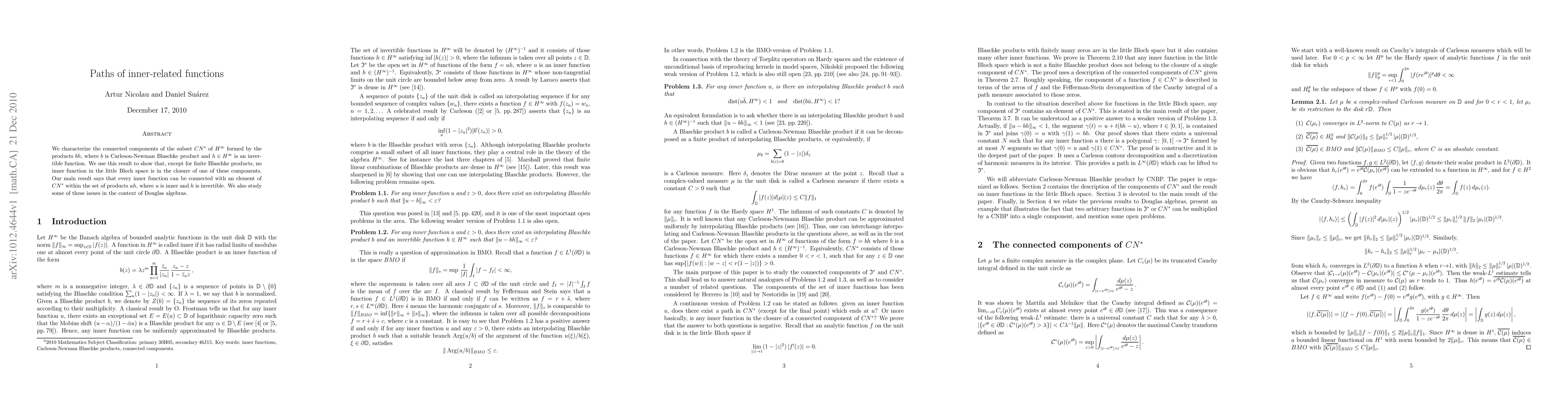 We characterize the connected components of the subset $\cni$ of $H^\infty$ formed by the products $bh$, where $b$ is Carleson-Newman Blaschke product and $h\in H^\infty$ is an invertible function. We use this result to show that, except for finite Blaschke products, no inner function in the little Bloch space is in the closure of one of these components. Our main result says that every inner function can be connected with an element of $\cni$ within the set of products $uh$, where $u$ is inner and $h$ is invertible. We also study some of these issues in the context of Douglas algebras.