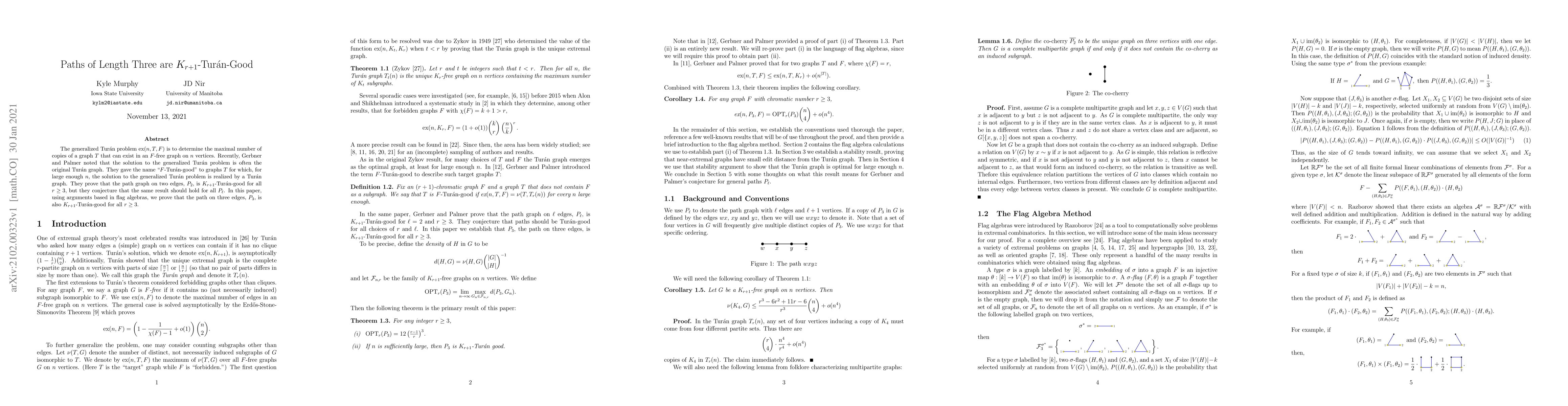 This paper proves that the path graph with three edges, $P_3$, is $K_{r+1}$-Tur\'an-good for all $r \ge 3$, supporting a conjecture that $P_\ell$ is $K_{r+1}$-Tur\'an-good for all paths, based on arguments involving flag algebras.
