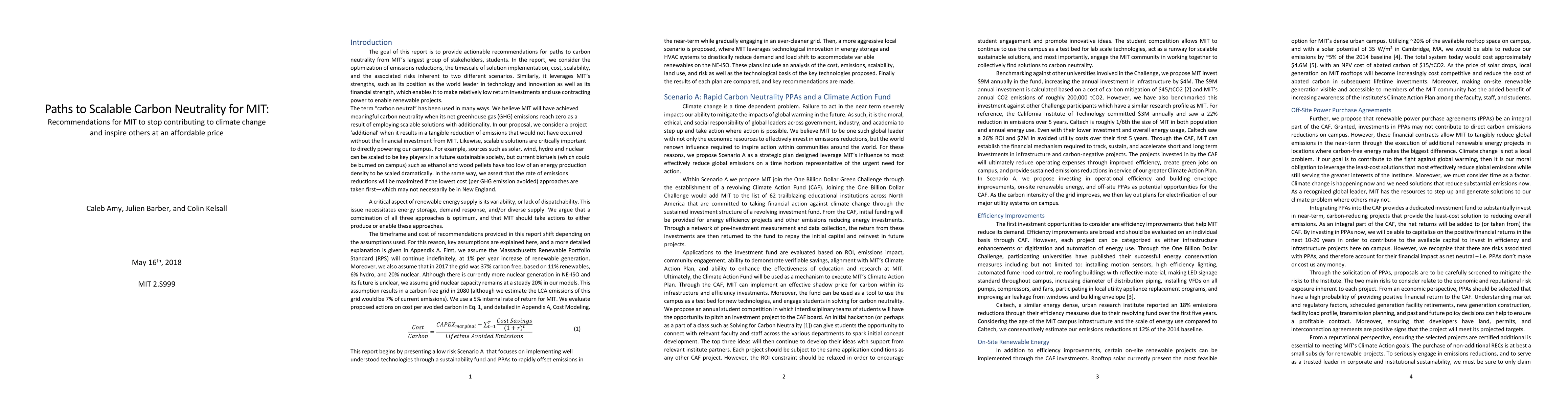 The goal of this report is to provide actionable recommendations for paths to carbon neutrality from MITs largest group of stakeholders, students. In the report, we consider the optimization of emissions reductions, the timescale of solution implementation, cost, scalability, and the associated risks inherent to two different scenarios. Similarly, it leverages MITs strengths, such as its position as the world leader in technology and innovation as well as its financial strength, which enables it to make relatively low return investments and use contracting power to enable renewable projects.