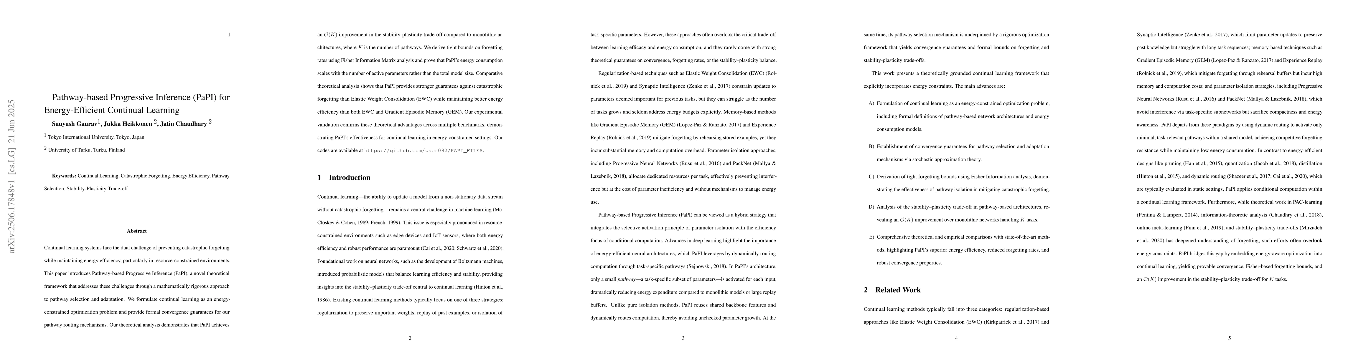 Continual learning systems face the dual challenge of preventing catastrophic forgetting while maintaining energy efficiency, particularly in resource-constrained environments. This paper introduces Pathway-based Progressive Inference (PaPI), a novel theoretical framework that addresses these challenges through a mathematically rigorous approach to pathway selection and adaptation. We formulate continual learning as an energy-constrained optimization problem and provide formal convergence guarantees for our pathway routing mechanisms. Our theoretical analysis demonstrates that PaPI achieves an $\mathcal{O}(K)$ improvement in the stability-plasticity trade-off compared to monolithic architectures, where $K$ is the number of pathways. We derive tight bounds on forgetting rates using Fisher Information Matrix analysis and prove that PaPI's energy consumption scales with the number of active parameters rather than the total model size. Comparative theoretical analysis shows that PaPI provides stronger guarantees against catastrophic forgetting than Elastic Weight Consolidation (EWC) while maintaining better energy efficiency than both EWC and Gradient Episodic Memory (GEM). Our experimental validation confirms these theoretical advantages across multiple benchmarks, demonstrating PaPI's effectiveness for continual learning in energy-constrained settings. Our codes are available at https://github.com/zser092/PAPI_FILES.