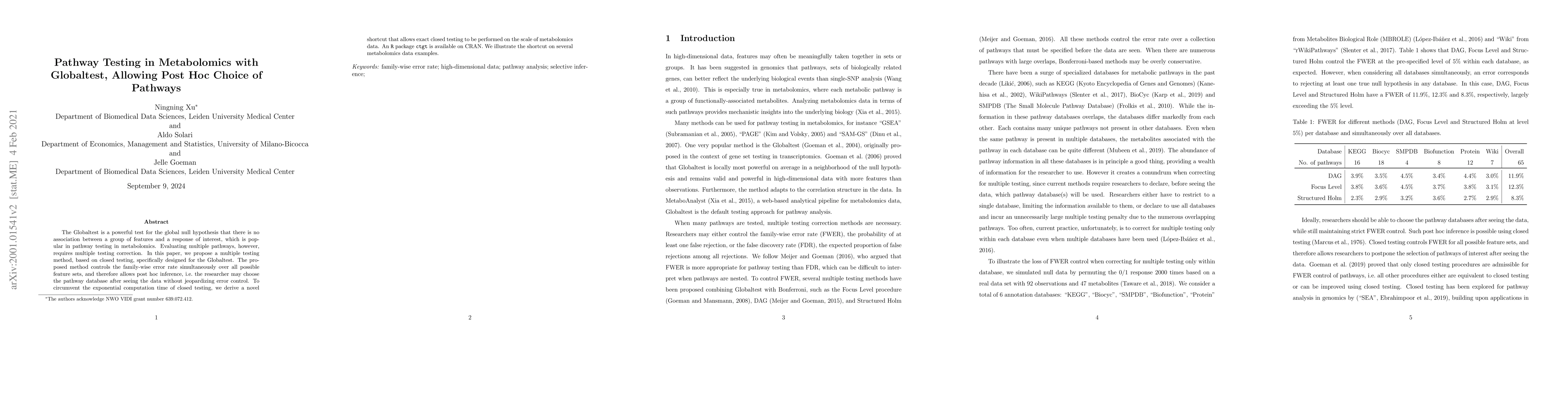 This paper proposes a novel multiple testing method based on closed testing for the Globaltest in metabolomics pathway analysis, which controls the family-wise error rate and allows post hoc pathway selection without compromising error control. A computational shortcut is introduced to manage the exponential computation time, and an R package, ctgt, is provided for practical application.