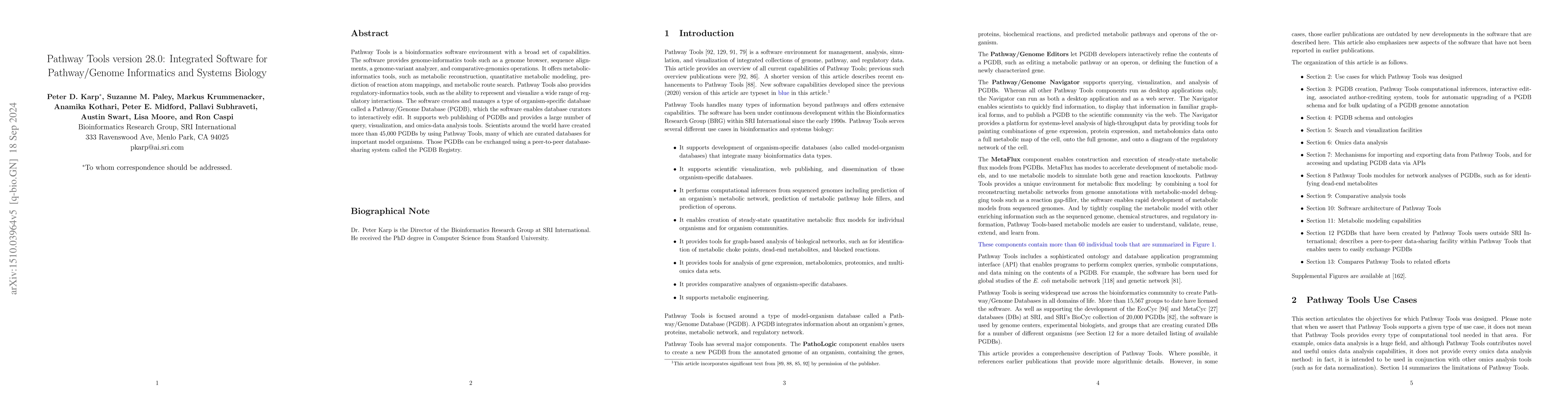 Pathway Tools is a bioinformatics software environment with a broad set of capabilities. The software provides genome-informatics tools such as a genome browser, sequence alignments, a genome-variant analyzer, and comparative-genomics operations. It offers metabolic-informatics tools, such as metabolic reconstruction, quantitative metabolic modeling, prediction of reaction atom mappings, and metabolic route search. Pathway Tools also provides regulatory-informatics tools, such as the ability to represent and visualize a wide range of regulatory interactions. The software creates and manages a type of organism-specific database called a Pathway/Genome Database (PGDB), which the software enables database curators to interactively edit. It supports web publishing of PGDBs and provides a large number of query, visualization, and omics-data analysis tools. Scientists around the world have created more than 9,800 PGDBs by using Pathway Tools, many of which are curated databases for important model organisms. Those PGDBs can be exchanged using a peer-to-peer database-sharing system called the PGDB Registry.