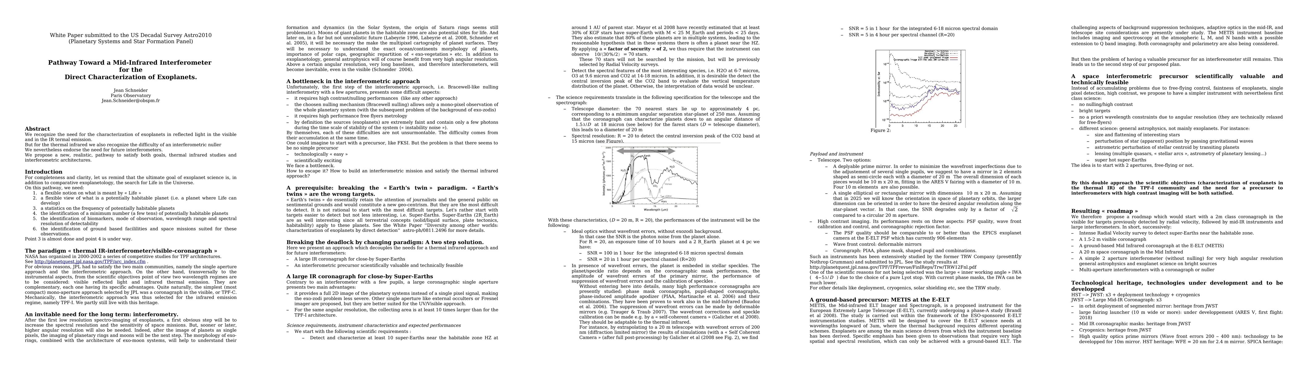 We recognize the need for the characterization of exoplanets in reflected light in the visible and in the IR termal emission. But for the thermal infrared we also recognize the difficulty of an interferometric nuller We nevertheless endorse the need for future interferometers. We propose a new, realistic, pathway to satisfy both goals, thermal infrared studies and interferometric architectures.