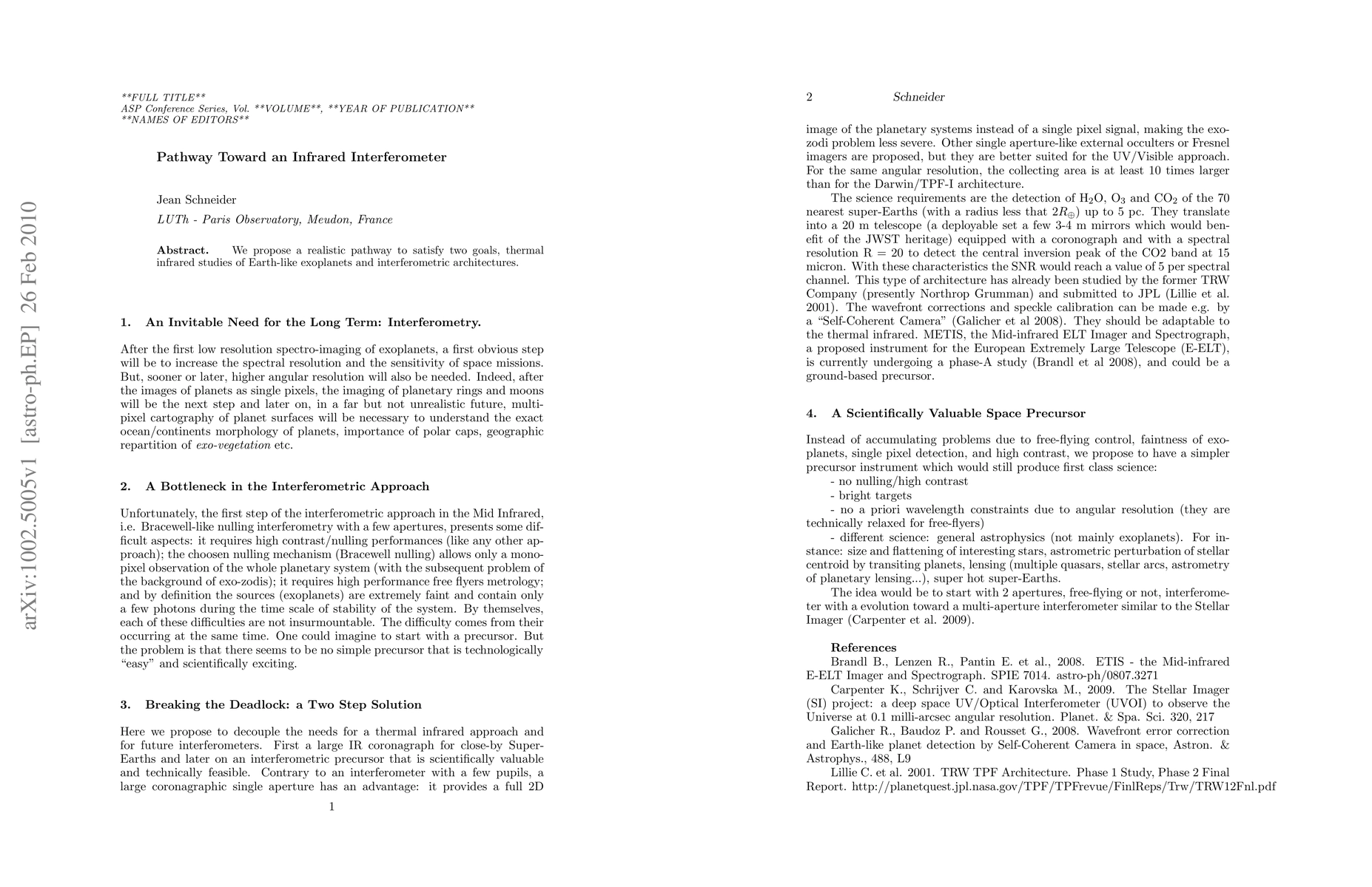 We propose a realistic pathway to satisfy two goals, thermal infrared studies of Earth-like exoplanets and interferometric architectures.