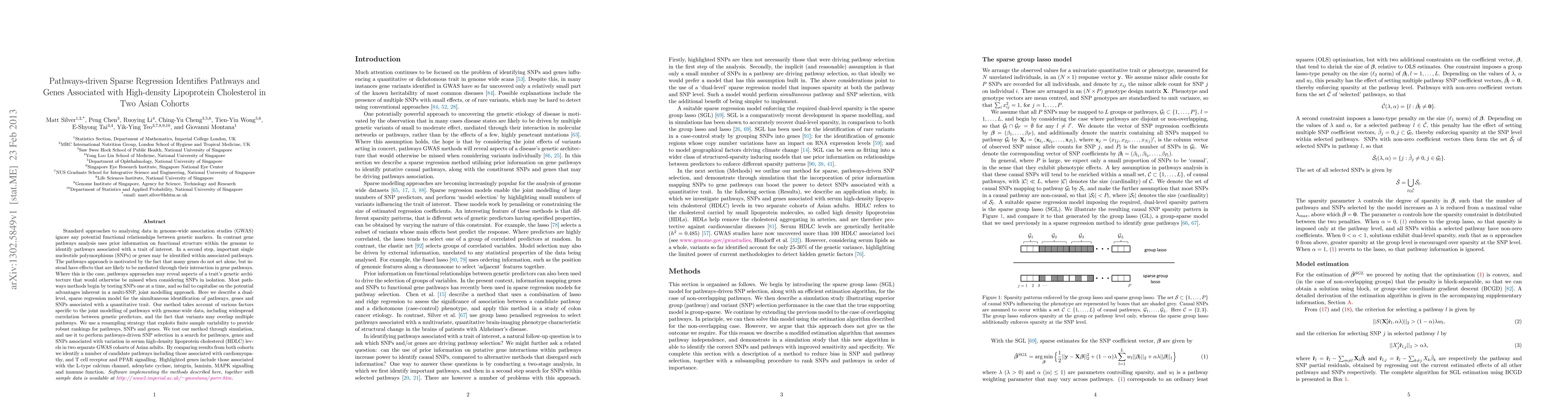 Standard approaches to analysing data in genome-wide association studies (GWAS) ignore any potential functional relationships between genetic markers. In contrast gene pathways analysis uses prior information on functional structure within the genome to identify pathways associated with a trait of interest. In a second step, important single nucleotide polymorphisms (SNPs) or genes may be identified within associated pathways. Most pathways methods begin by testing SNPs one at a time, and so fail to capitalise on the potential advantages inherent in a multi-SNP, joint modelling approach. Here we describe a dual-level, sparse regression model for the simultaneous identification of pathways, genes and SNPs associated with a quantitative trait. Our method takes account of various factors specific to the joint modelling of pathways with genome-wide data, including widespread correlation between genetic predictors, and the fact that variants may overlap multiple pathways. We use a resampling strategy that exploits finite sample variability to provide robust rankings for pathways, SNPs and genes. We test our method through simulation, and use it to perform pathways-driven SNP selection in a search for pathways, genes and SNPs associated with variation in serum high-density lipoprotein cholesterol (HDLC) levels in two separate GWAS cohorts of Asian adults. By comparing results from both cohorts we identify a number of candidate pathways including those associated with cardiomyopathy, and T cell receptor and PPAR signalling. Highlighted genes include those associated with the L-type calcium channel, adenylate cyclase, integrin, laminin, MAPK signalling and immune function.