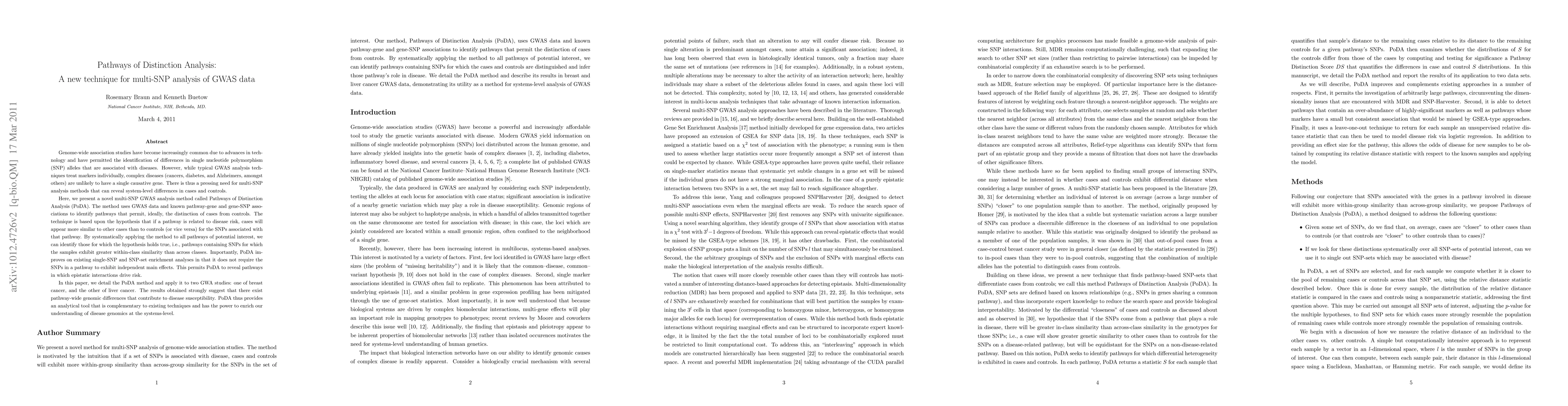 Genome-wide association studies have become increasingly common due to advances in technology and have permitted the identification of differences in single nucleotide polymorphism (SNP) alleles that are associated with diseases. However, while typical GWAS analysis techniques treat markers individually, complex diseases are unlikely to have a single causative gene. There is thus a pressing need for multi-SNP analysis methods that can reveal system-level differences in cases and controls. Here, we present a novel multi-SNP GWAS analysis method called Pathways of Distinction Analysis (PoDA). The method uses GWAS data and known pathway-gene and gene-SNP associations to identify pathways that permit, ideally, the distinction of cases from controls. The technique is based upon the hypothesis that if a pathway is related to disease risk, cases will appear more similar to other cases than to controls for the SNPs associated with that pathway. By systematically applying the method to all pathways of potential interest, we can identify those for which the hypothesis holds true, i.e., pathways containing SNPs for which the samples exhibit greater within-class similarity than across classes. Importantly, PoDA improves on existing single-SNP and SNP-set enrichment analyses in that it does not require the SNPs in a pathway to exhibit independent main effects. This permits PoDA to reveal pathways in which epistatic interactions drives risk. In this paper, we detail the PoDA method and apply it to two GWA studies: one of breast cancer, and the other of liver cancer. The results obtained strongly suggest that there exist pathway-wide genomic differences that contribute to disease susceptibility. PoDA thus provides an analytical tool that is complementary to existing techniques and has the power to enrich our understanding of disease genomics at the systems-level.