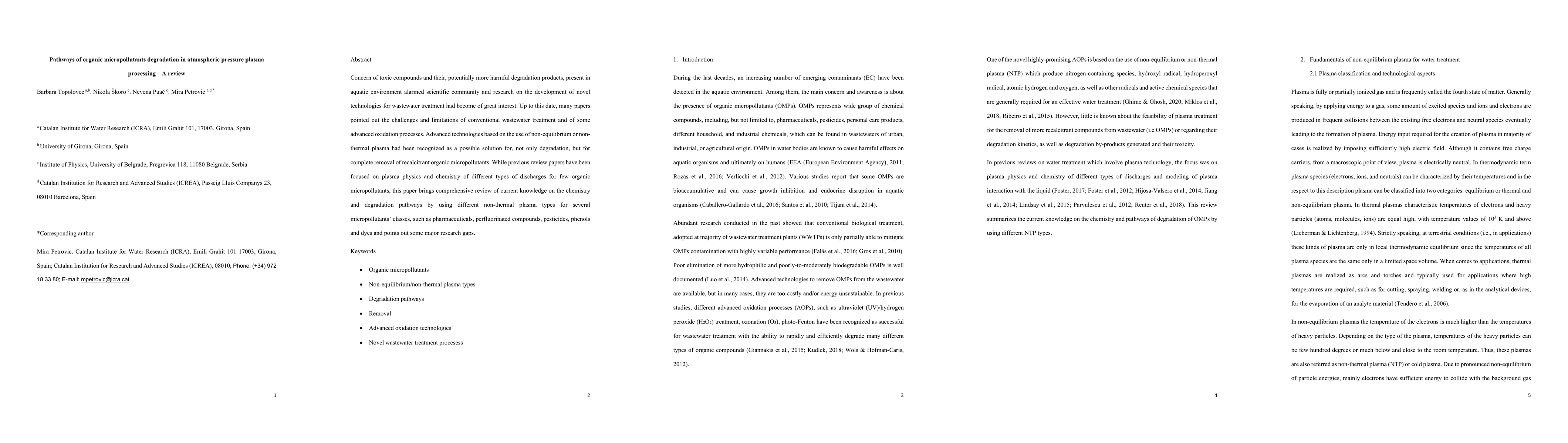 This paper reviews the degradation pathways of various organic micropollutants using atmospheric pressure plasma processing, highlighting the effectiveness of non-thermal plasma technologies for the complete removal of recalcitrant pollutants and identifying key research gaps in current knowledge.