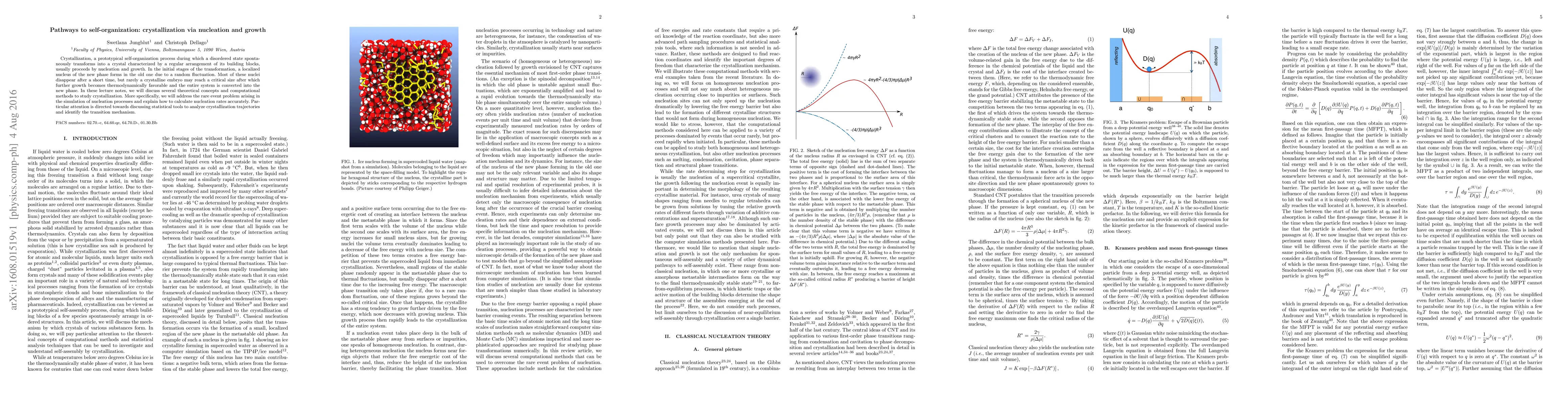 Crystallization, a prototypical self-organization process during which a disordered state spontaneously transforms into a crystal characterized by a regular arrangement of its building blocks, usually proceeds by nucleation and growth. In the initial stages of the transformation, a localized nucleus of the new phase forms in the old one due to a random fluctuation. Most of these nuclei disappear after a short time, but rarely a crystalline embryo may reach a critical size after which further growth becomes thermodynamically favorable and the entire system is converted into the new phase. In these lecture notes, we will discuss several theoretical concepts and computational methods to study crystallization. More specifically, we will address the rare event problem arising in the simulation of nucleation processes and explain how to calculate nucleation rates accurately. Particular attention is directed towards discussing statistical tools to analyze crystallization trajectories and identify the transition mechanism.