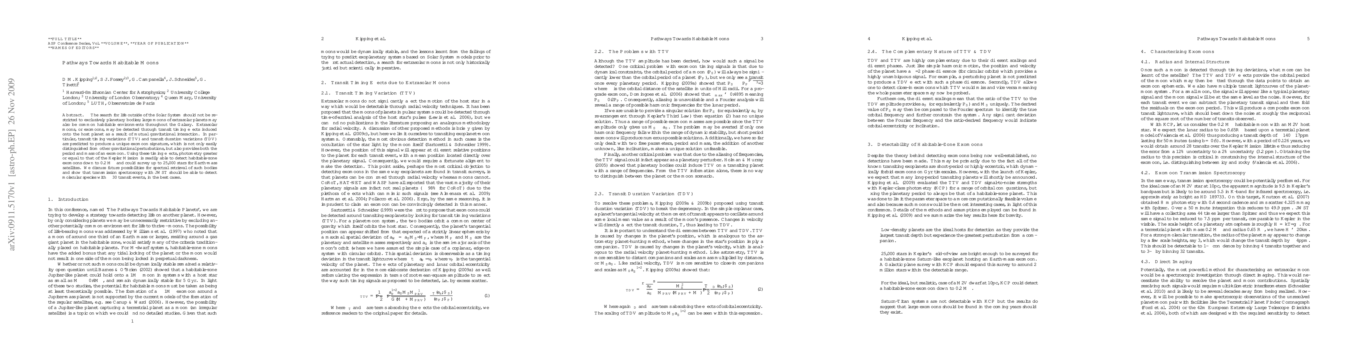 The paper presents a detailed analysis of transit timing variations and transit duration variations as methods for detecting and characterizing exomoons, providing equations and derivations for these effects.