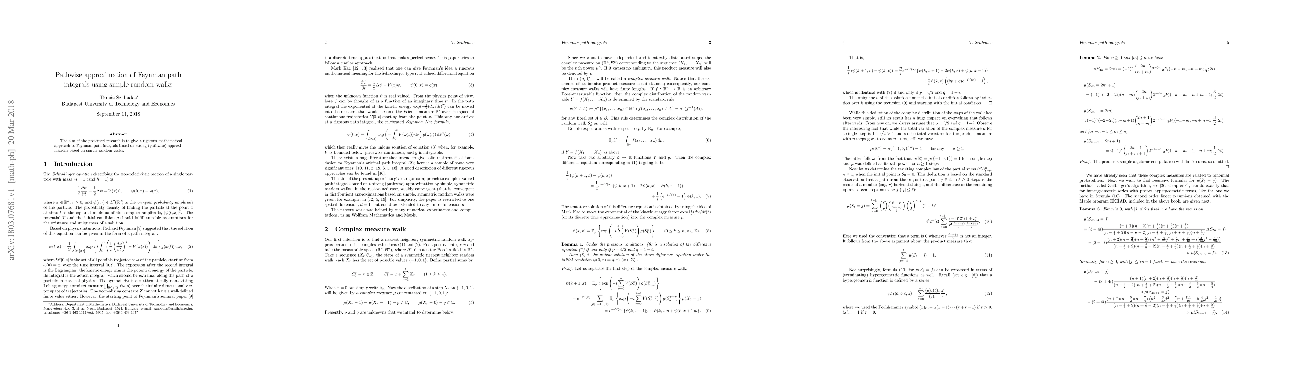 The aim of the presented research is to give a rigorous mathematical approach to Feynman path integrals based on strong (pathwise) approximations based on simple random walks.