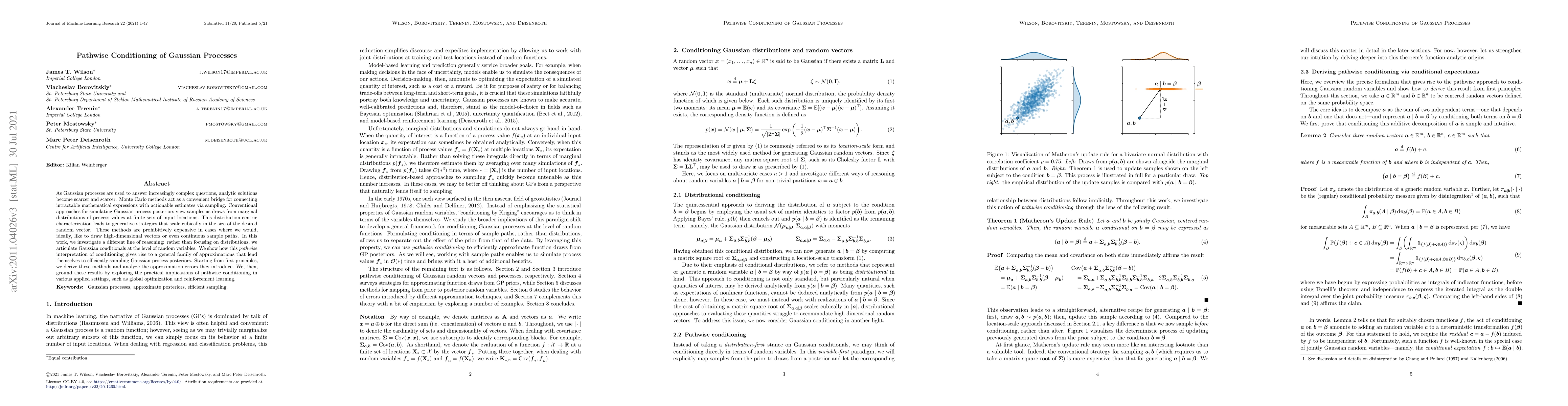 As Gaussian processes are used to answer increasingly complex questions, analytic solutions become scarcer and scarcer. Monte Carlo methods act as a convenient bridge for connecting intractable mathematical expressions with actionable estimates via sampling. Conventional approaches for simulating Gaussian process posteriors view samples as draws from marginal distributions of process values at finite sets of input locations. This distribution-centric characterization leads to generative strategies that scale cubically in the size of the desired random vector. These methods are prohibitively expensive in cases where we would, ideally, like to draw high-dimensional vectors or even continuous sample paths. In this work, we investigate a different line of reasoning: rather than focusing on distributions, we articulate Gaussian conditionals at the level of random variables. We show how this pathwise interpretation of conditioning gives rise to a general family of approximations that lend themselves to efficiently sampling Gaussian process posteriors. Starting from first principles, we derive these methods and analyze the approximation errors they introduce. We, then, ground these results by exploring the practical implications of pathwise conditioning in various applied settings, such as global optimization and reinforcement learning.