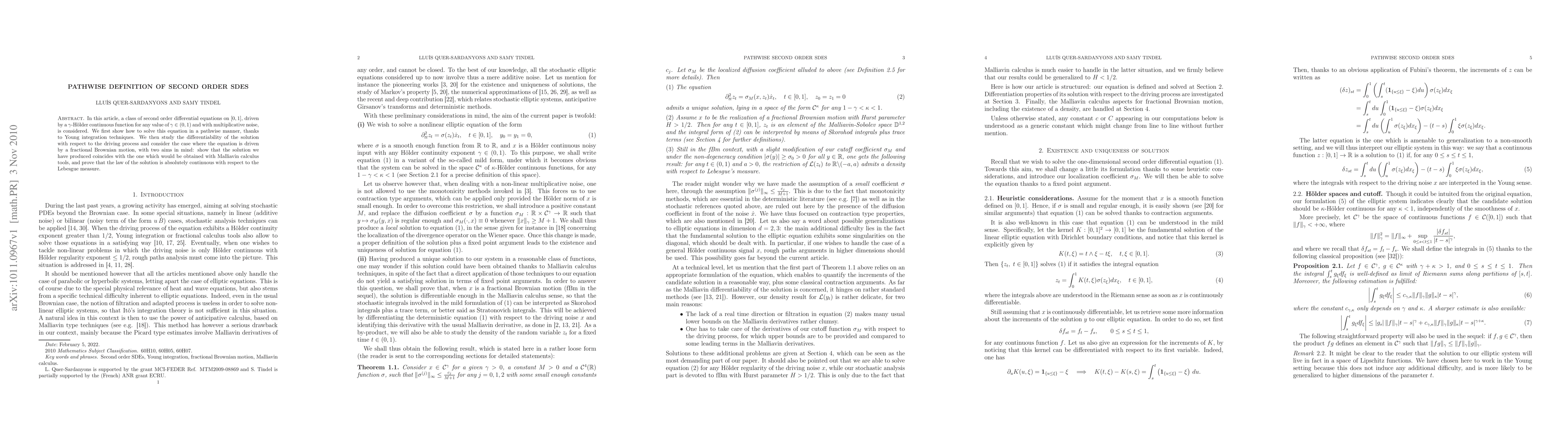 In this article, a class of second order differential equations on [0,1], driven by a general H\"older continuous function and with multiplicative noise, is considered. We first show how to solve this equation in a pathwise manner, thanks to Young integration techniques. We then study the differentiability of the solution with respect to the driving process and consider the case where the equation is driven by a fractional Brownian motion, with two aims in mind: show that the solution we have produced coincides with the one which would be obtained with Malliavin calculus tools, and prove that the law of the solution is absolutely continuous with respect to the Lebesgue measure.
