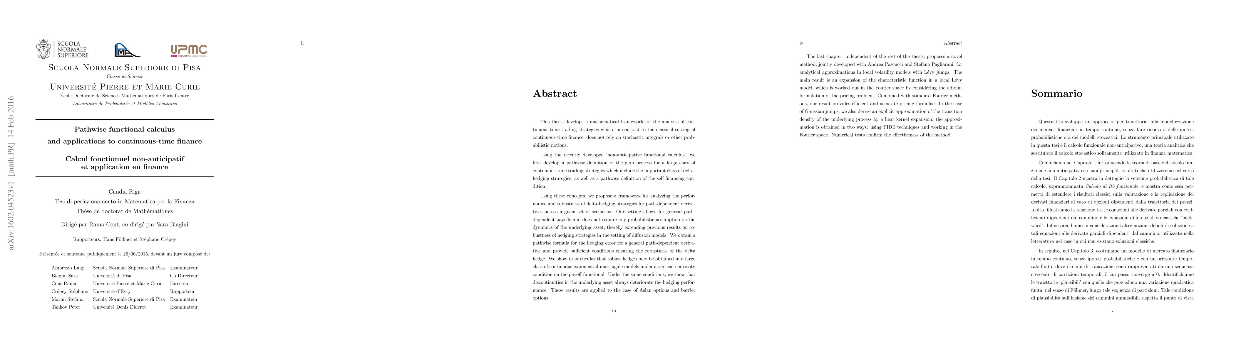 This thesis develops a pathwise functional calculus for analyzing continuous-time trading strategies without relying on probabilistic notions, providing a robust framework for delta-hedging strategies and path-dependent derivatives. It also introduces a novel analytical method for local volatility models with Lévy jumps, validated by numerical tests.