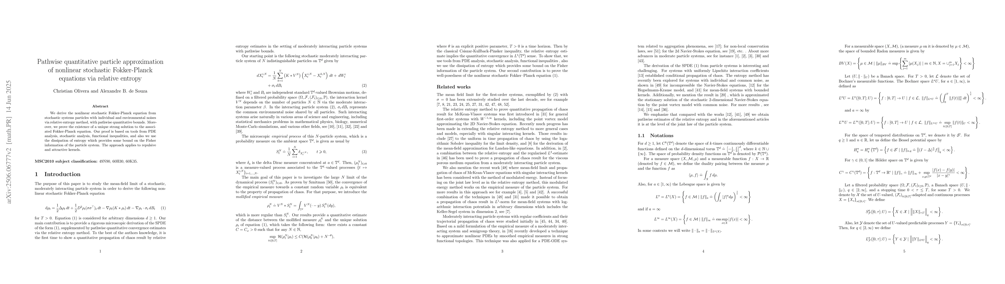 We derive non-linear stochastic Fokker-Planck equation from stochastic systems particles with individual and environmental noise via relative entropy method, with pathwise quantitative bounds. Moreover, we prove the existence of a unique strong solution to the associated Fokker-Planck equation. Our proof is based on tools from PDE analysis, stochastic analysis, functional inequalities, and also we use the dissipation of entropy which provides some bound on the Fisher information of the particle system. The approach applies to repulsive and attractive kernels.