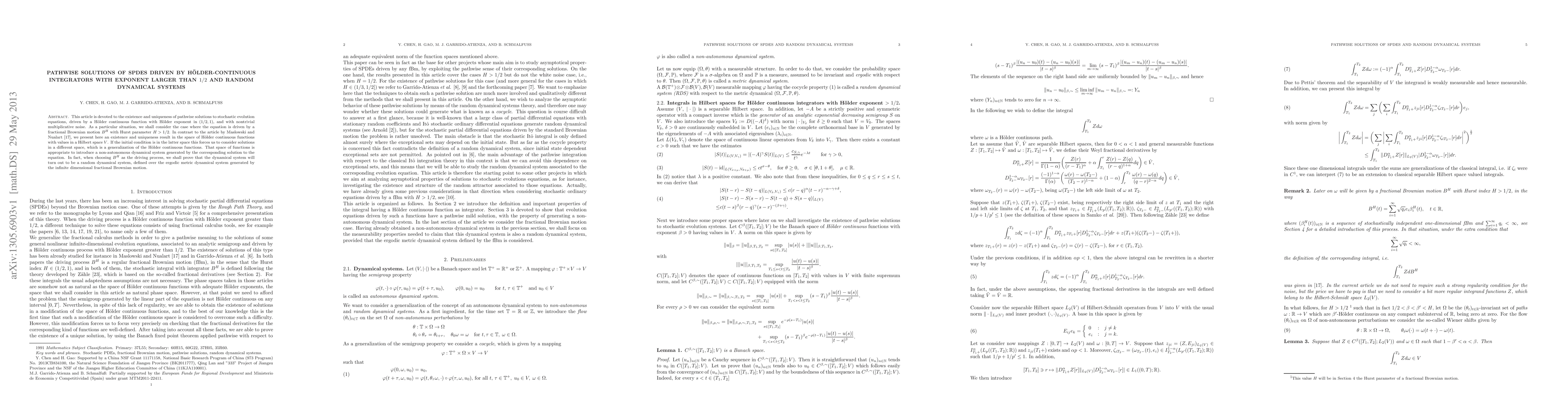 This article is devoted to the existence and uniqueness of pathwise solutions to stochastic evolution equations, driven by a H\"older continuous function with H\"older exponent in $(1/2,1)$, and with nontrivial multiplicative noise. As a particular situation, we shall consider the case where the equation is driven by a fractional Brownian motion $B^H$ with Hurst parameter $H>1/2$. In contrast to the article by Maslowski and Nualart, we present here an existence and uniqueness result in the space of H\"older continuous functions with values in a Hilbert space $V$. If the initial condition is in the latter space this forces us to consider solutions in a different space, which is a generalization of the H\"older continuous functions. That space of functions is appropriate to introduce a non-autonomous dynamical system generated by the corresponding solution to the equation. In fact, when choosing $B^H$ as the driving process, we shall prove that the dynamical system will turn out to be a random dynamical system, defined over the ergodic metric dynamical system generated by the infinite dimensional fractional Brownian motion