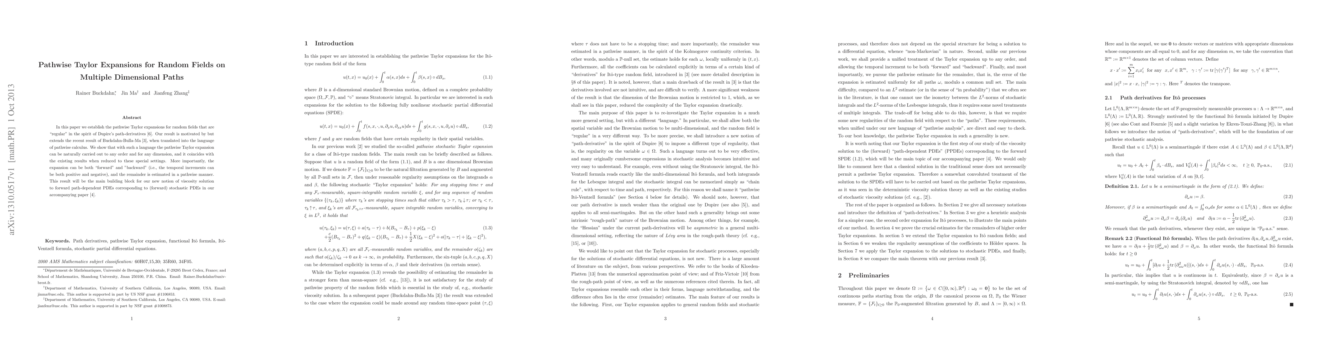 In this paper we establish the pathwise Taylor expansions for random fields that are "regular" in the spirit of Dupire's path-derivatives \cite{Dupire}. Our result is motivated by but extends the recent result of Buckdahn-Bulla-Ma \cite{BBM}, when translated into the language of pathwise calculus. We show that with such a language the pathwise Taylor expansion can be naturally carried out to any order and for any dimension, and it coincides with the existing results when reduced to these special settings. More importantly, the expansion can be both "forward" and "backward" (i.e., the temporal increments can be both positive and negative), and the remainder is estimated in a pathwise manner. This result will be the main building block for our new notion of viscosity solution to forward path-dependent PDEs corresponding to (forward) stochastic PDEs in our accompanying paper \cite{BMZ}.