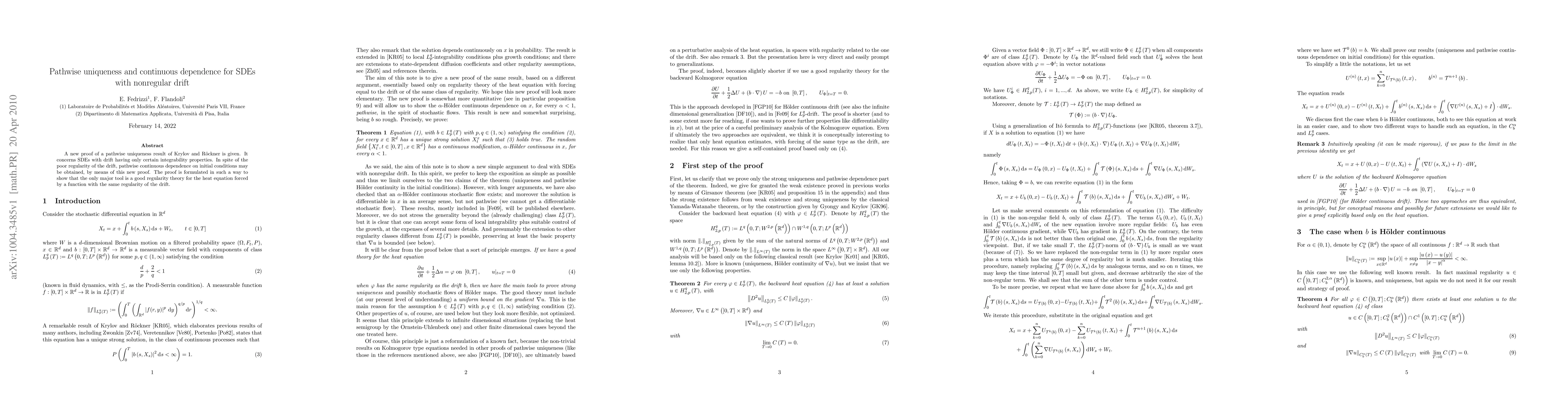 Summary: This paper presents a new proof for pathwise uniqueness in stochastic differential equations (SDEs) with nonregular drift, demonstrating continuous dependence on initial conditions despite the drift's poor regularity. The key tool used is a robust regularity theory for the heat equation driven by a function with similar regularity.