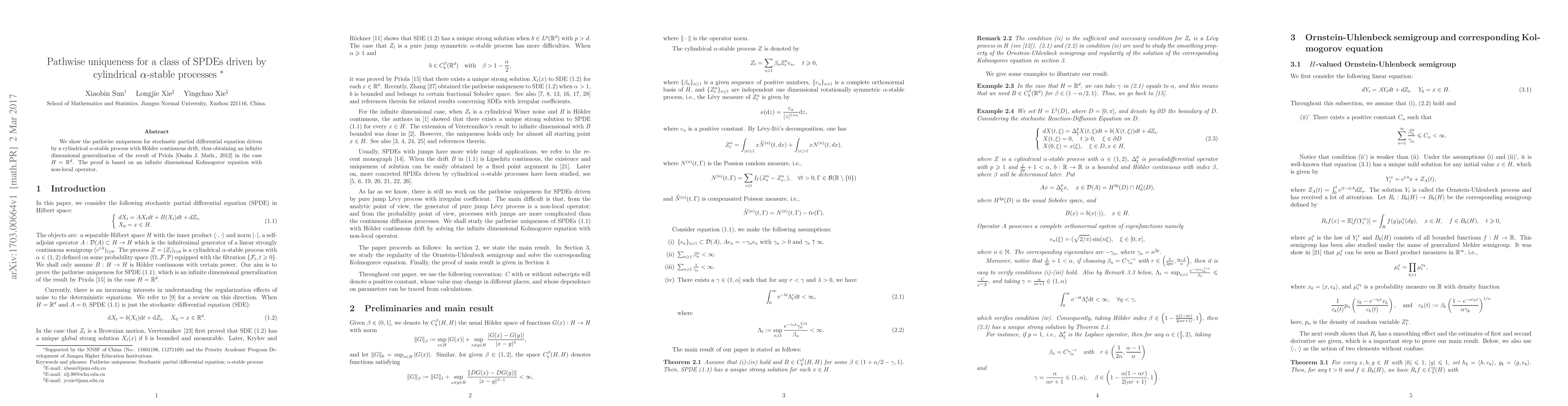 This paper establishes pathwise uniqueness for stochastic partial differential equations driven by cylindrical $\alpha$-stable processes with H\"older continuous drift, extending Priola's result in an infinite dimensional setting. The proof leverages an infinite dimensional Kolmogorov equation featuring a non-local operator.