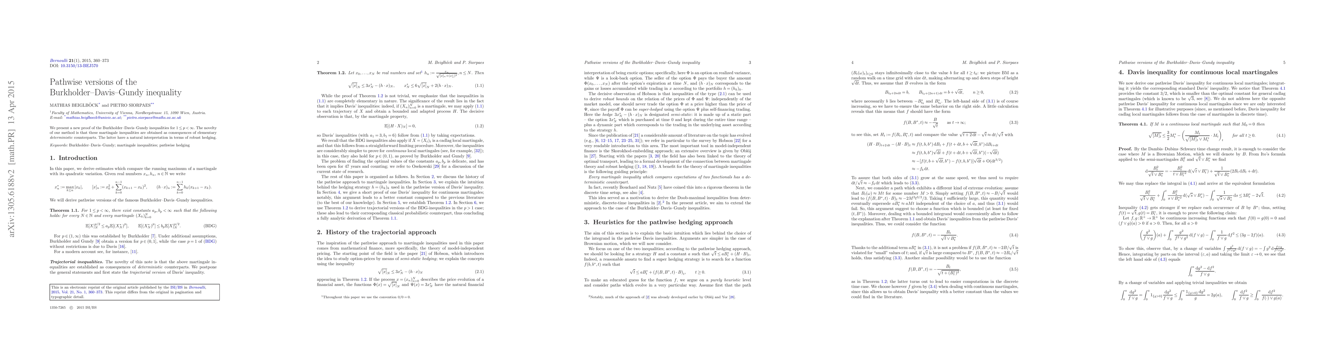 Summary: This paper presents a novel proof of the Burkholder-Davis-Gundy inequalities using deterministic counterparts, offering a new perspective on robust hedging through elementary martingale inequalities.