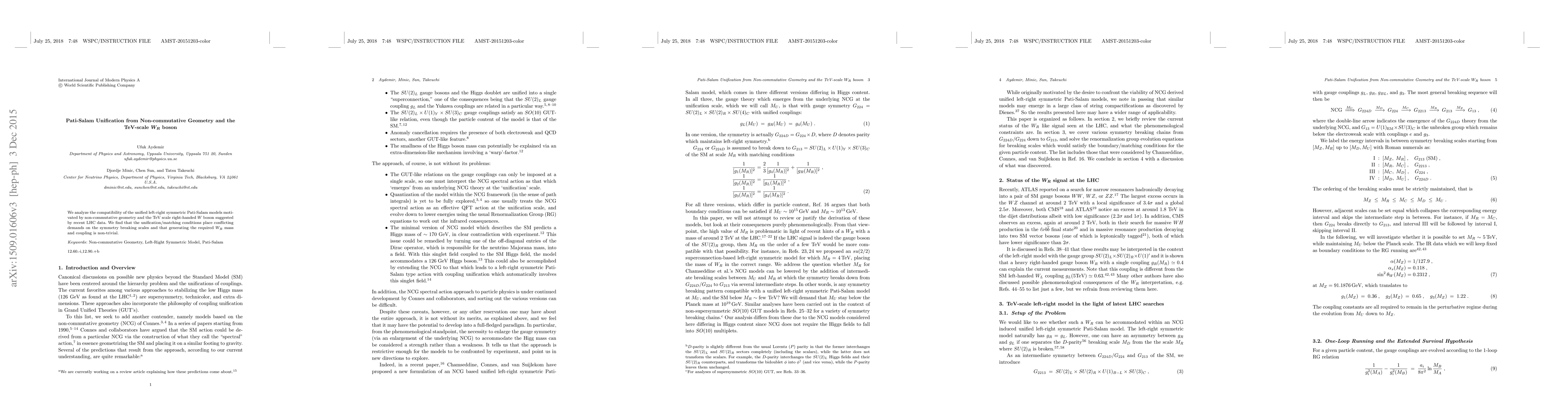 This paper explores the compatibility of Pati-Salam unification inspired by non-commutative geometry with the TeV-scale right-handed W boson indicated by LHC data. The study reveals conflicting demands on symmetry breaking scales, making it challenging to generate the necessary W_R mass and coupling.
