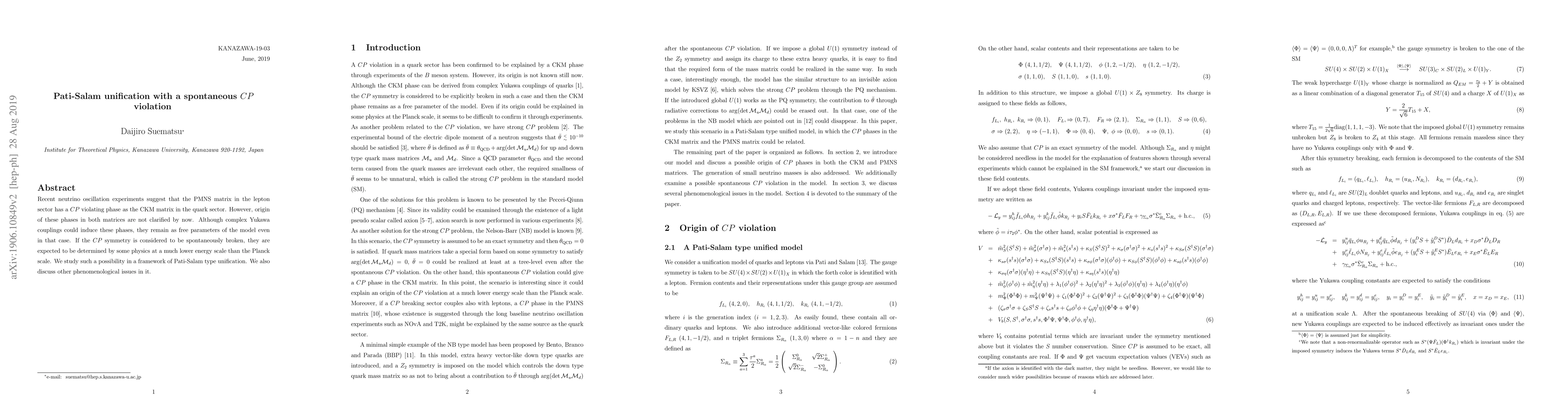 Recent neutrino oscillation experiments suggest that the PMNS matrix in the lepton sector has a $CP$ violating phase as the CKM matrix in the quark sector. However, origin of these phases in both matrices are not clarified by now. Although complex Yukawa couplings could induce these phases, they remain as free parameters of the model even in that case. If the $CP$ symmetry is considered to be spontaneously broken, they are expected to be determined by some physics at a much lower energy scale than the Planck scale. We study such a possibility in a framework of Pati-Salam type unification. We also discuss other phenomenological issues in it.
