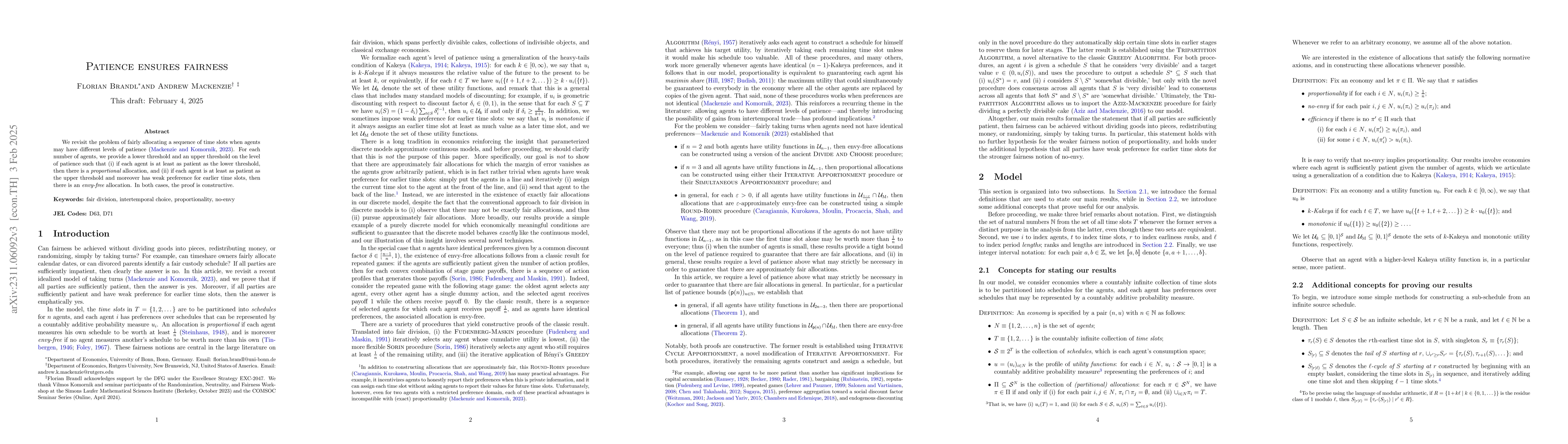 We revisit the problem of fairly allocating a sequence of time slots when agents may have different levels of patience (Mackenzie and Komornik, 2023). For each number of agents, we provide a lower threshold and an upper threshold on the level of patience such that (i) if each agent is at least as patient as the lower threshold, then there is a proportional allocation, and (ii) if each agent is at least as patient as the upper threshold and moreover has weak preference for earlier time slots, then there is an envy-free allocation. In both cases, the proof is constructive.