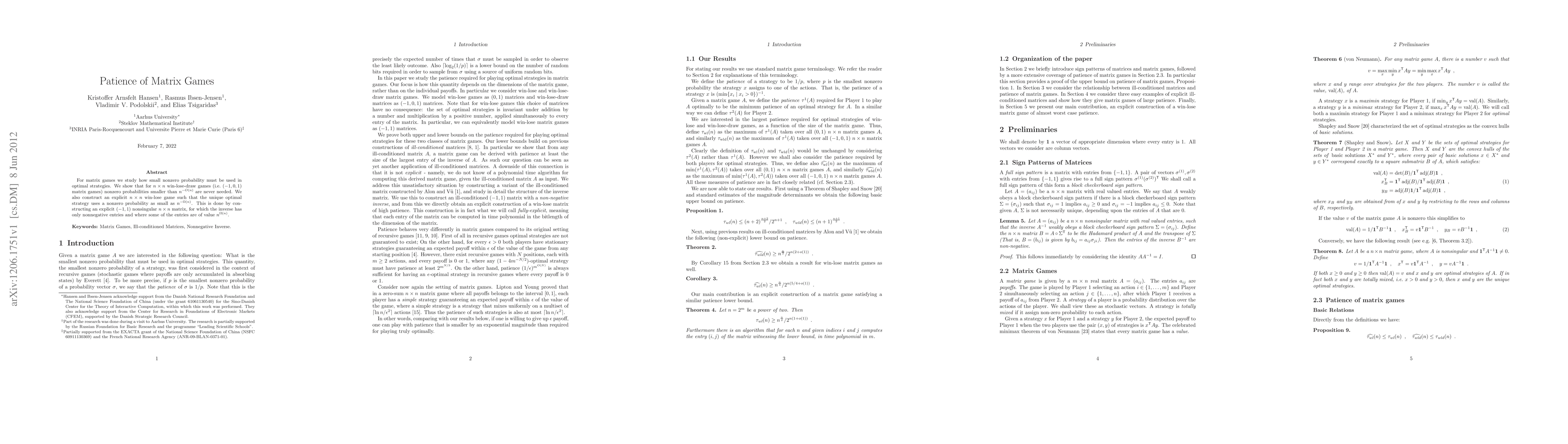 For matrix games we study how small nonzero probability must be used in optimal strategies. We show that for nxn win-lose-draw games (i.e. (-1,0,1) matrix games) nonzero probabilities smaller than n^{-O(n)} are never needed. We also construct an explicit nxn win-lose game such that the unique optimal strategy uses a nonzero probability as small as n^{-Omega(n)}. This is done by constructing an explicit (-1,1) nonsingular nxn matrix, for which the inverse has only nonnegative entries and where some of the entries are of value n^{Omega(n)}.