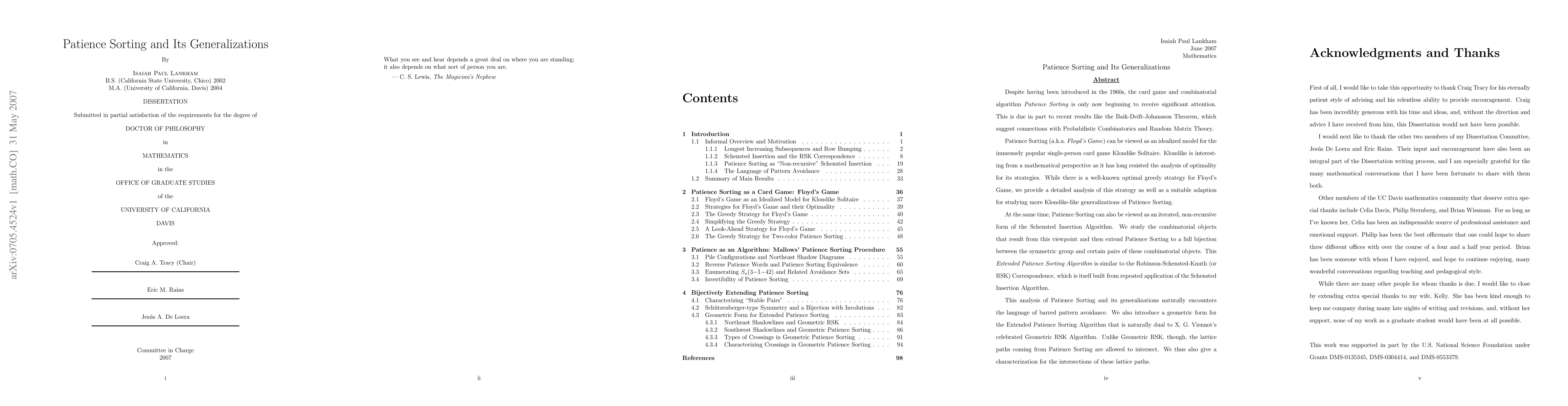 This dissertation collects together results on Patience Sorting and its generalizations. It incorporates the results of math.CO/0506358, math.CO/0507031, and math.CO/0512122, as well as previously unpublished results.