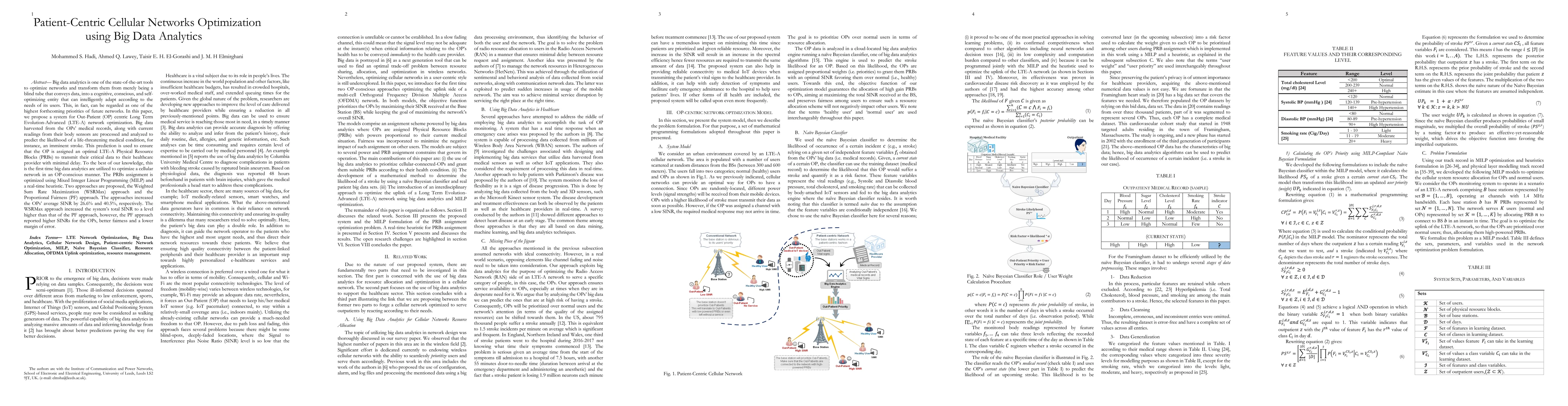 This research paper proposes using big data analytics to optimize cellular networks for out-patient patients, predicting life-threatening conditions and assigning optimal resource blocks for minimal delay, resulting in 26.6% and 40.5% increases in average SINR.