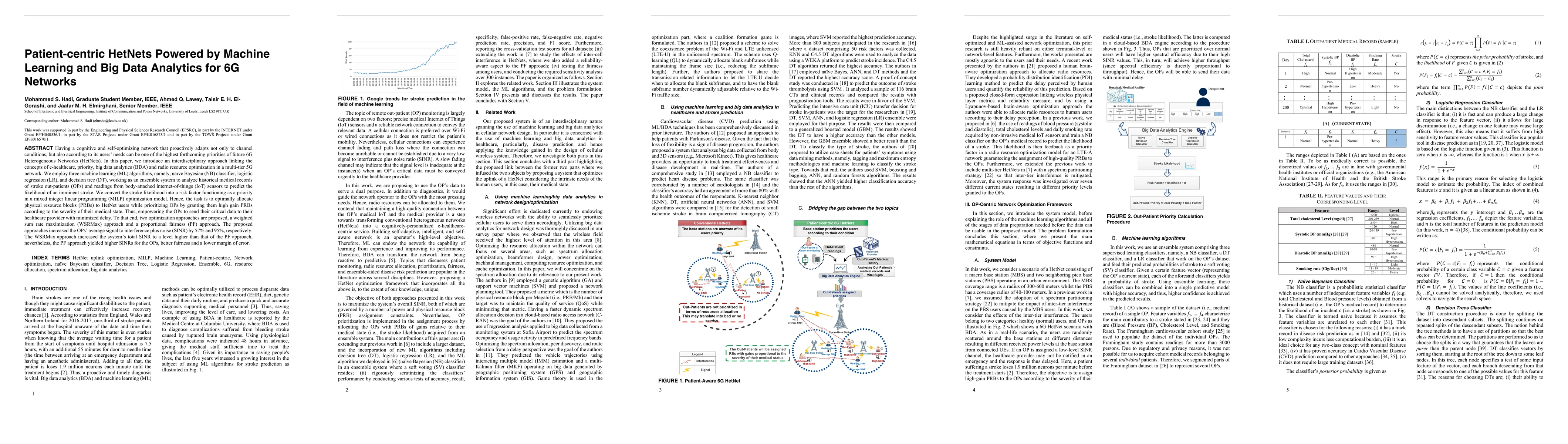 This paper proposes a patient-centric 6G HetNet utilizing machine learning and big data analytics to prioritize stroke out-patients. Employing NB, LR, and DT algorithms, it predicts stroke likelihood from medical records and IoT sensors, converting it into a priority for PRB allocation. Two optimization approaches, WSRMax and PF, enhance OPs' SINR by 57% and 95%, respectively, with PF offering better fairness and lower error margin.