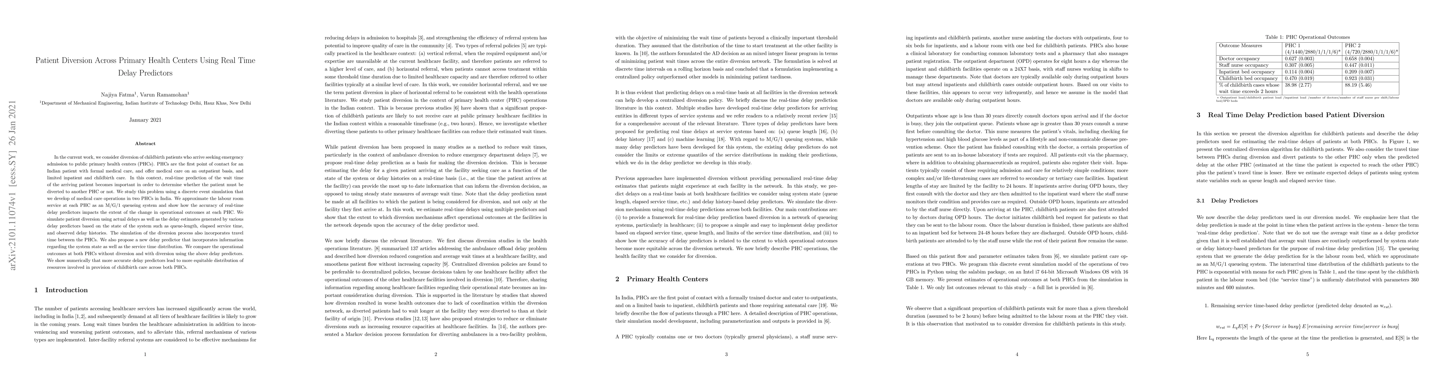 In the current work, we consider diversion of childbirth patients who arrive seeking emergency admission to public primary health centers (PHCs). PHCs are the first point of contact for an Indian patient with formal medical care, and offer medical care on an outpatient basis, and limited inpatient and childbirth care. In this context, real-time prediction of the wait time of the arriving patient becomes important in order to determine whether the patient must be diverted to another PHC or not. We study this problem using a discrete event simulation that we develop of medical care operations in two PHCs in India. We approximate the labour room service at each PHC as an M/G/1 queueing system and show how the accuracy of real-time delay predictors impacts the extent of the change in operational outcomes at each PHC. We simulate patient diversion using actual delays as well as the delay estimates generated by various delay predictors based on the state of the system such as queue-length, elapsed service time, and observed delay histories. The simulation of the diversion process also incorporates travel time between the PHCs. We also propose a new delay predictor that incorporates information regarding the system state as well as the service time distribution. We compare the operational outcomes at both PHCs without diversion and with diversion using the above delay predictors. We show numerically that more accurate delay predictors lead to more equitable distribution of resources involved in provision of childbirth care across both PHCs.