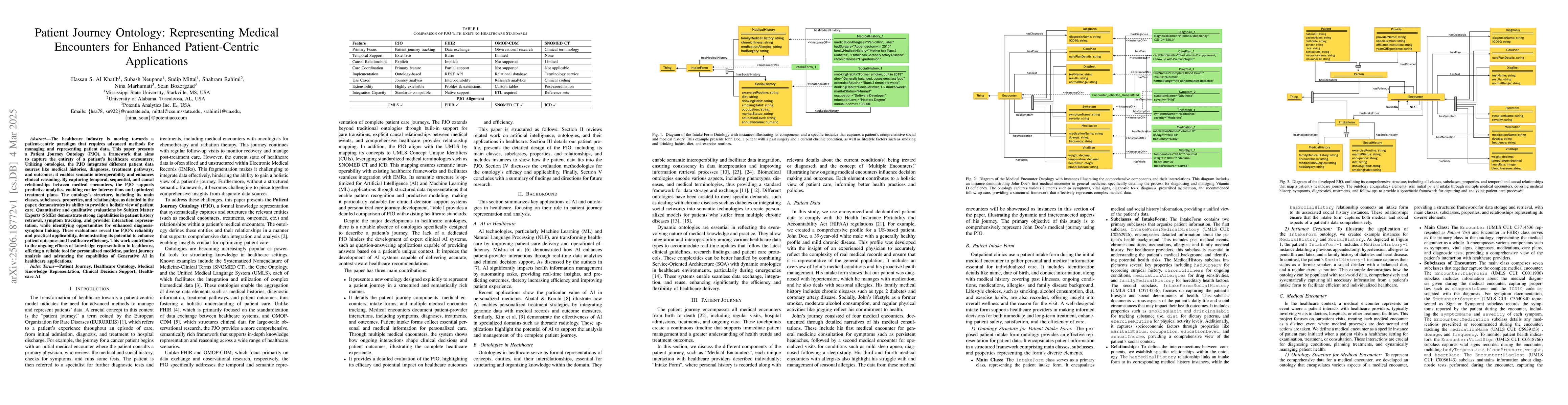 The healthcare industry is moving towards a patient-centric paradigm that requires advanced methods for managing and representing patient data. This paper presents a Patient Journey Ontology (PJO), a framework that aims to capture the entirety of a patient's healthcare encounters. Utilizing ontologies, the PJO integrates different patient data sources like medical histories, diagnoses, treatment pathways, and outcomes; it enables semantic interoperability and enhances clinical reasoning. By capturing temporal, sequential, and causal relationships between medical encounters, the PJO supports predictive analytics, enabling earlier interventions and optimized treatment plans. The ontology's structure, including its main classes, subclasses, properties, and relationships, as detailed in the paper, demonstrates its ability to provide a holistic view of patient care. Quantitative and qualitative evaluations by Subject Matter Experts (SMEs) demonstrate strong capabilities in patient history retrieval, symptom tracking, and provider interaction representation, while identifying opportunities for enhanced diagnosis-symptom linking. These evaluations reveal the PJO's reliability and practical applicability, demonstrating its potential to enhance patient outcomes and healthcare efficiency. This work contributes to the ongoing efforts of knowledge representation in healthcare, offering a reliable tool for personalized medicine, patient journey analysis and advancing the capabilities of Generative AI in healthcare applications.
