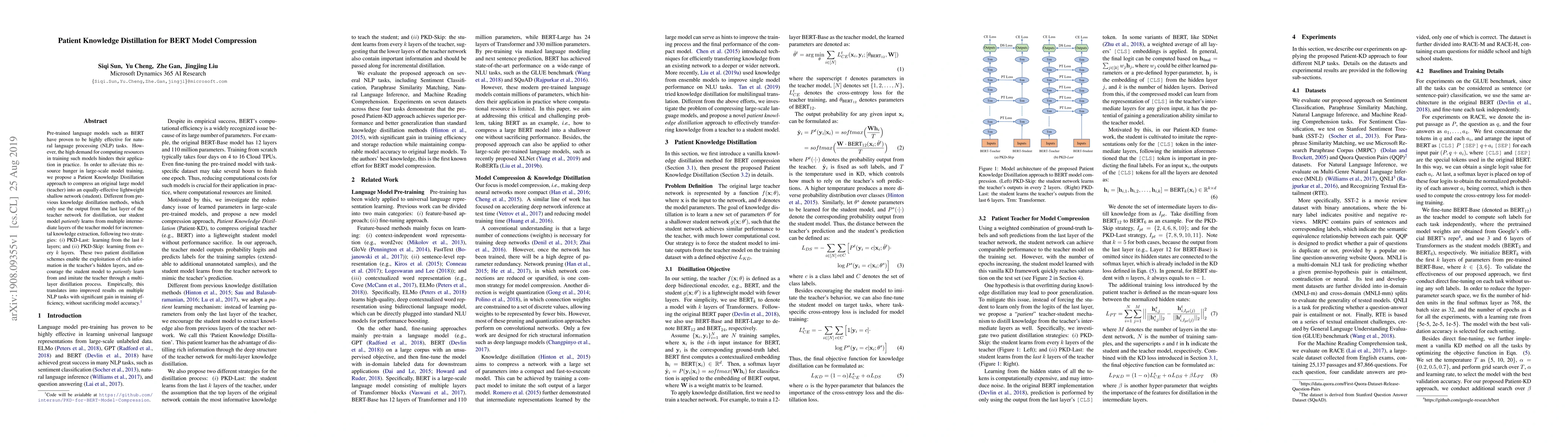 This paper proposes a Patient Knowledge Distillation approach to compress large BERT models into lightweight networks, using multiple intermediate layers for knowledge extraction. This method improves performance on NLP tasks while significantly enhancing training efficiency without compromising accuracy.