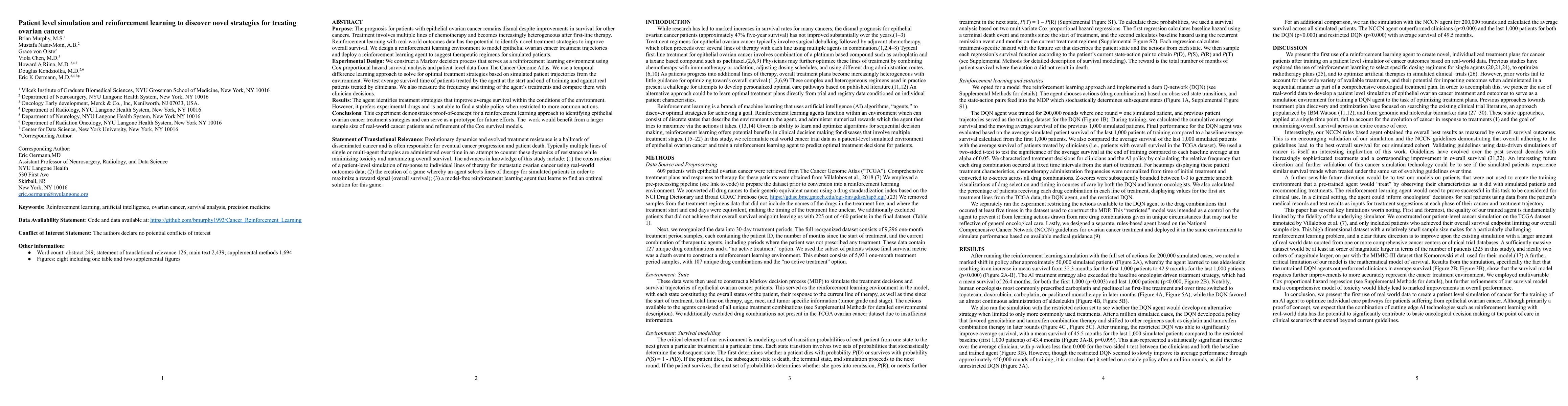 This paper employs reinforcement learning to simulate and discover novel treatment strategies for ovarian cancer, aiming to improve overall survival by analyzing real-world outcomes and modeling treatment trajectories. The study uses model-free reinforcement learning to explore effective therapeutic regimens for simulated patients.