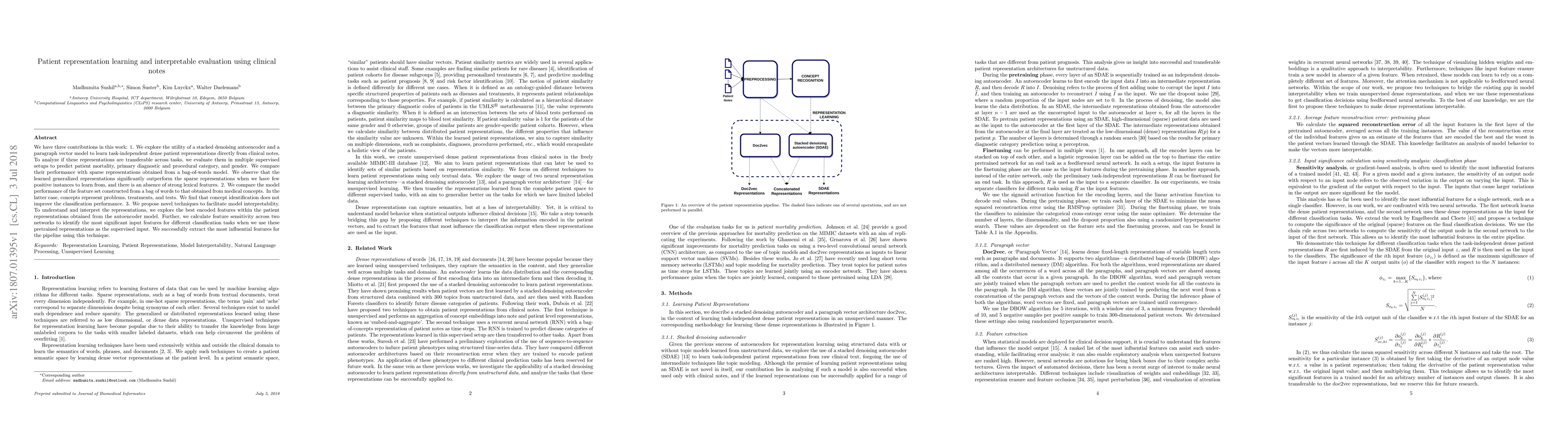 This paper develops dense patient representations from clinical notes using stacked denoising autoencoders and paragraph vector models, showing they outperform sparse representations in certain conditions. It also finds that medical concept identification does not enhance classification performance and introduces interpretability techniques to identify the most influential features for various tasks.