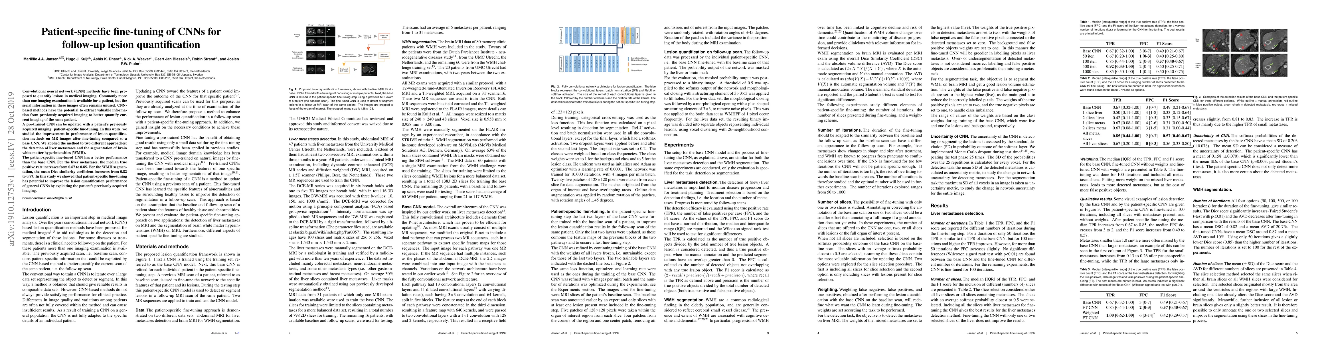 Convolutional neural network (CNN) methods have been proposed to quantify lesions in medical imaging. Commonly more than one imaging examination is available for a patient, but the serial information in these images often remains unused. CNN-based methods have the potential to extract valuable information from previously acquired imaging to better quantify current imaging of the same patient. A pre-trained CNN can be updated with a patient's previously acquired imaging: patient-specific fine-tuning. In this work, we studied the improvement in performance of lesion quantification methods on MR images after fine-tuning compared to a base CNN. We applied the method to two different approaches: the detection of liver metastases and the segmentation of brain white matter hyperintensities (WMH). The patient-specific fine-tuned CNN has a better performance than the base CNN. For the liver metastases, the median true positive rate increases from 0.67 to 0.85. For the WMH segmentation, the mean Dice similarity coefficient increases from 0.82 to 0.87. In this study we showed that patient-specific fine-tuning has potential to improve the lesion quantification performance of general CNNs by exploiting the patient's previously acquired imaging.