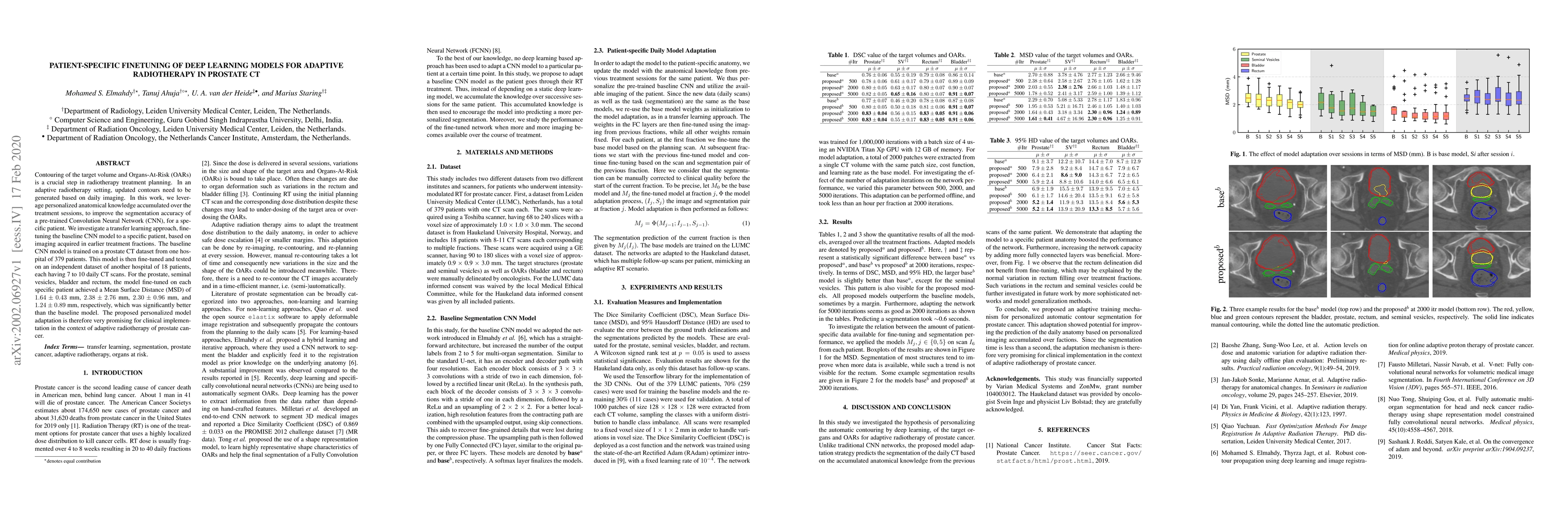 This research fine-tunes a pre-trained CNN model using transfer learning to improve segmentation accuracy for adaptive radiotherapy in prostate cancer, based on daily imaging. The fine-tuned model achieved significantly better Mean Surface Distance metrics for prostate, seminal vesicles, bladder, and rectum compared to the baseline model, indicating potential for clinical use in adaptive radiotherapy.