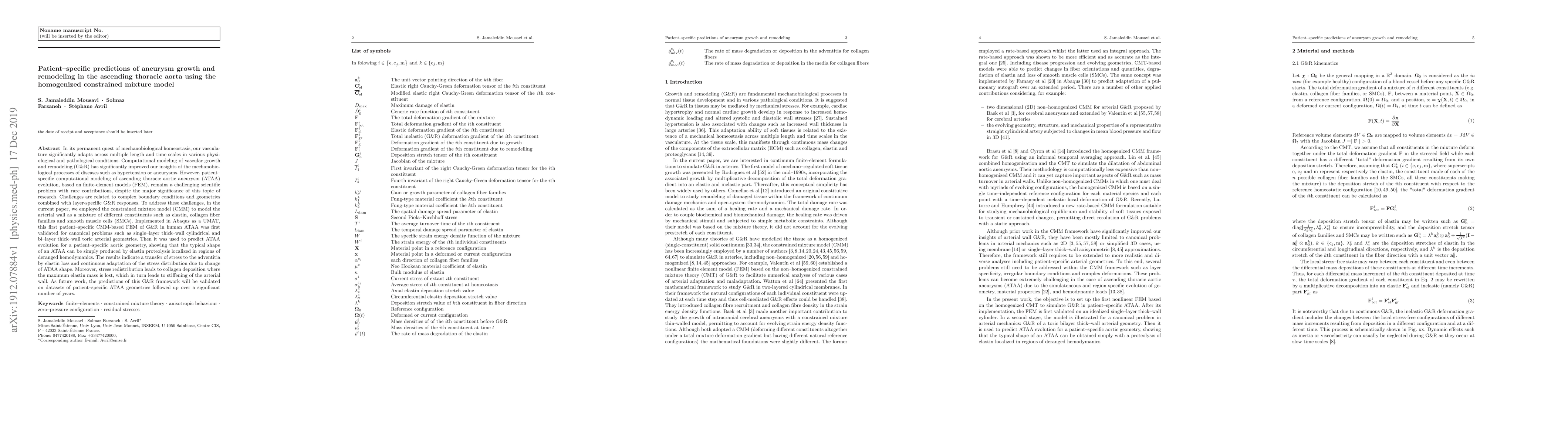 This paper develops a patient-specific finite-element model using a constrained mixture model to predict the growth and remodeling of ascending thoracic aortic aneurysms. The model, validated on canonical geometries, shows that elastin proteolysis in regions of abnormal hemodynamics drives aneurysm shape formation, leading to stress redistribution and collagen deposition.