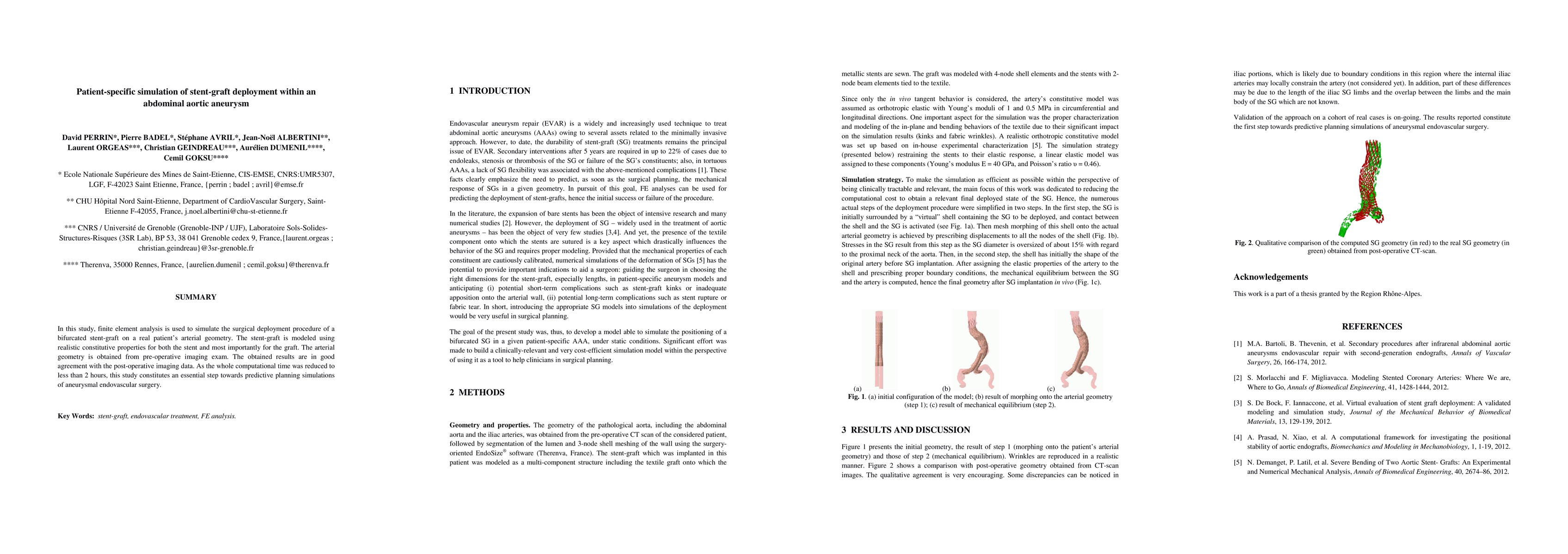 This study employs finite element analysis to simulate the deployment of a stent-graft within an abdominal aortic aneurysm using patient-specific arterial geometry from pre-operative imaging. The results align well with post-operative imaging, demonstrating the potential for predictive planning in endovascular surgery with computational efficiency.