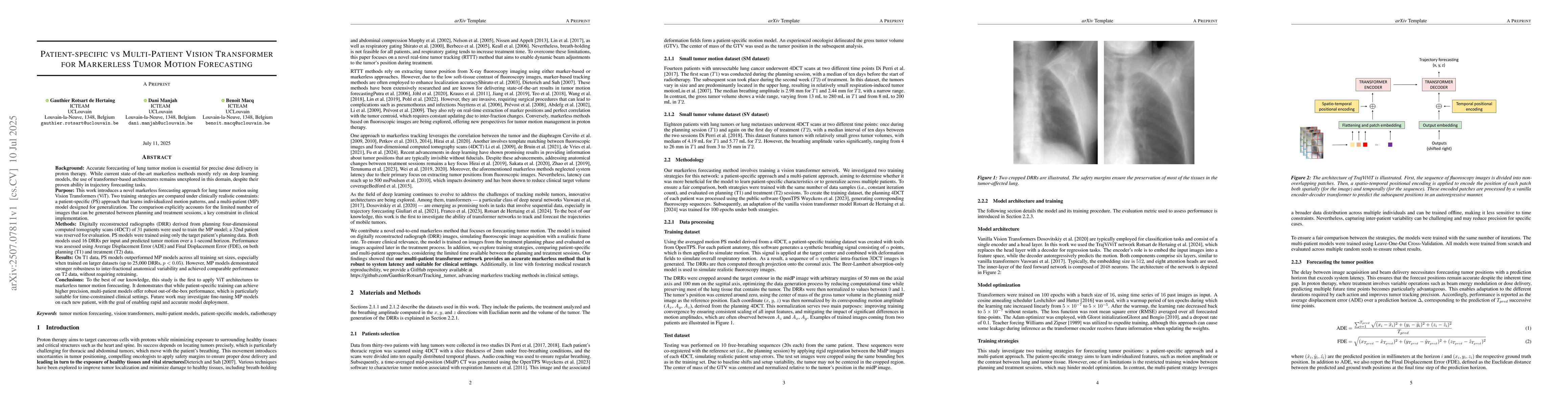 Background: Accurate forecasting of lung tumor motion is essential for precise dose delivery in proton therapy. While current markerless methods mostly rely on deep learning, transformer-based architectures remain unexplored in this domain, despite their proven performance in trajectory forecasting. Purpose: This work introduces a markerless forecasting approach for lung tumor motion using Vision Transformers (ViT). Two training strategies are evaluated under clinically realistic constraints: a patient-specific (PS) approach that learns individualized motion patterns, and a multi-patient (MP) model designed for generalization. The comparison explicitly accounts for the limited number of images that can be generated between planning and treatment sessions. Methods: Digitally reconstructed radiographs (DRRs) derived from planning 4DCT scans of 31 patients were used to train the MP model; a 32nd patient was held out for evaluation. PS models were trained using only the target patient's planning data. Both models used 16 DRRs per input and predicted tumor motion over a 1-second horizon. Performance was assessed using Average Displacement Error (ADE) and Final Displacement Error (FDE), on both planning (T1) and treatment (T2) data. Results: On T1 data, PS models outperformed MP models across all training set sizes, especially with larger datasets (up to 25,000 DRRs, p < 0.05). However, MP models demonstrated stronger robustness to inter-fractional anatomical variability and achieved comparable performance on T2 data without retraining. Conclusions: This is the first study to apply ViT architectures to markerless tumor motion forecasting. While PS models achieve higher precision, MP models offer robust out-of-the-box performance, well-suited for time-constrained clinical settings.