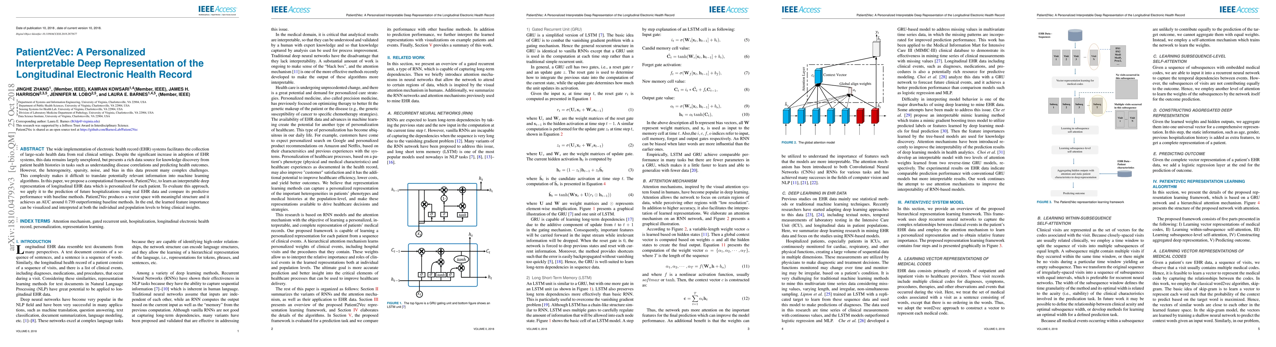 The paper introduces Patient2Vec, a framework for creating personalized, interpretable deep representations of longitudinal electronic health records (EHR) to predict future hospitalizations. It outperforms baseline methods with an AUC of 0.799 and allows for visualization and interpretation of feature importance for clinical insights.