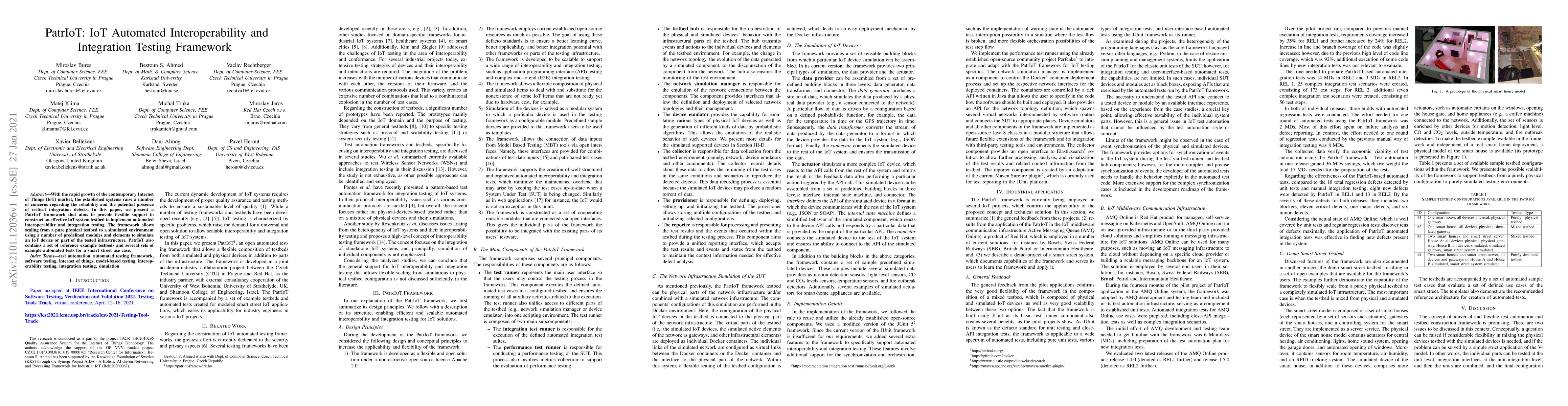 PatrIoT is a framework designed to automate interoperability and integration testing for IoT systems, addressing reliability concerns. It scales from physical to simulated environments using predefined modules and includes example testbeds and tests for smart street applications.