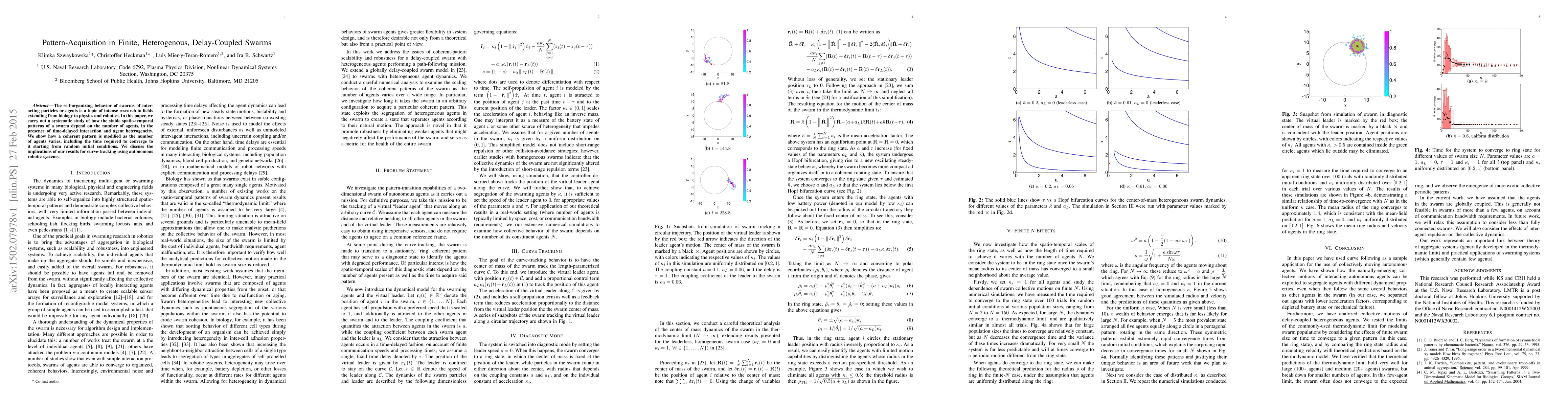 The self-organizing behavior of swarms of inter- acting particles or agents is a topic of intense research in fields extending from biology to physics and robotics. In this paper, we carry out a systematic study of how the stable spatio-temporal patterns of a swarm depend on the number of agents, in the presence of time-delayed interaction and agent heterogeneity. We show how a coherent pattern is modified as the number of agents varies, including the time required to converge to it starting from random initial conditions. We discuss the implications of our results for curve-tracking using autonomous robotic systems.
