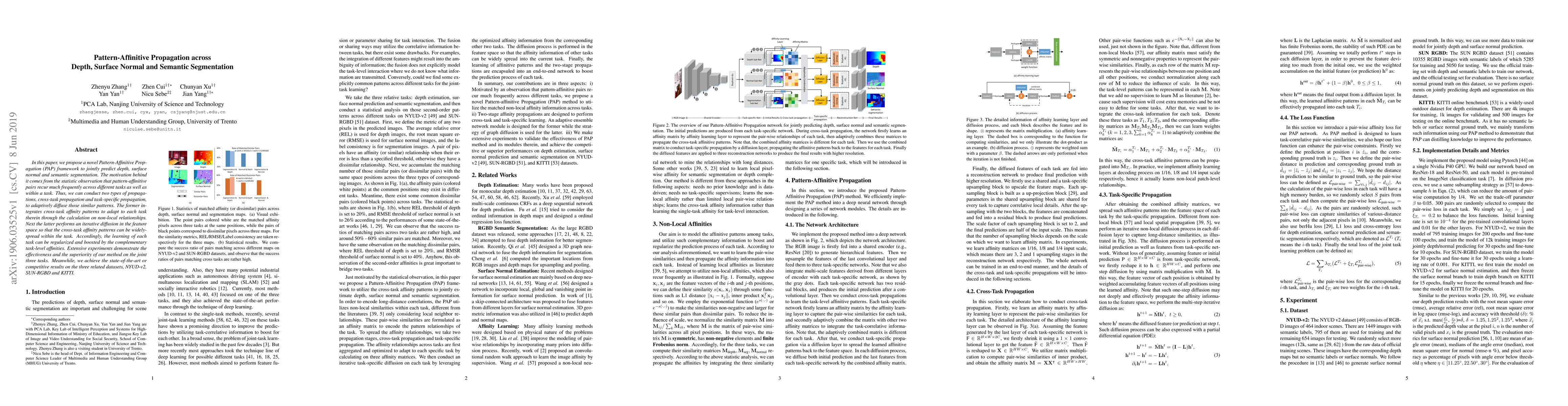 In this paper, we propose a novel Pattern-Affinitive Propagation (PAP) framework to jointly predict depth, surface normal and semantic segmentation. The motivation behind it comes from the statistic observation that pattern-affinitive pairs recur much frequently across different tasks as well as within a task. Thus, we can conduct two types of propagations, cross-task propagation and task-specific propagation, to adaptively diffuse those similar patterns. The former integrates cross-task affinity patterns to adapt to each task therein through the calculation on non-local relationships. Next the latter performs an iterative diffusion in the feature space so that the cross-task affinity patterns can be widely-spread within the task. Accordingly, the learning of each task can be regularized and boosted by the complementary task-level affinities. Extensive experiments demonstrate the effectiveness and the superiority of our method on the joint three tasks. Meanwhile, we achieve the state-of-the-art or competitive results on the three related datasets, NYUD-v2, SUN-RGBD and KITTI.