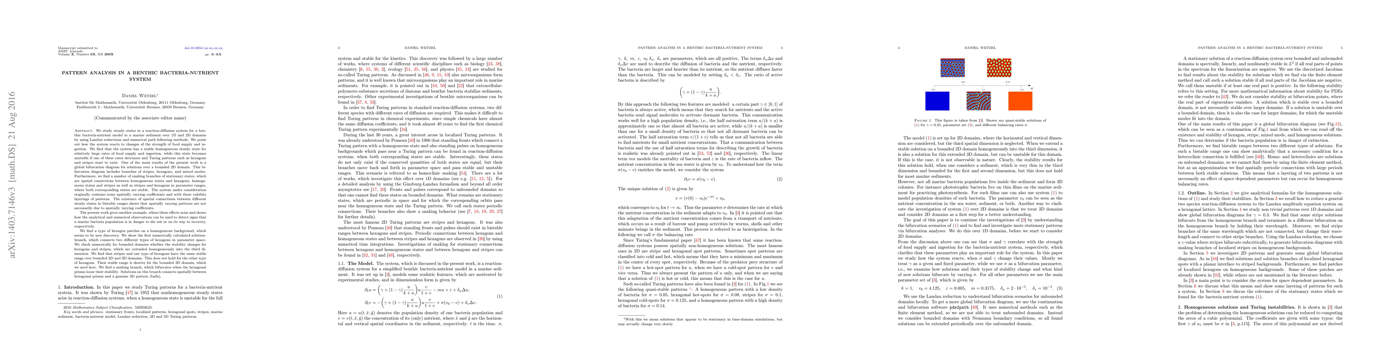 We study pattern formation in a reaction-diffusion system for a benthic bacteria-nutrient model in a marine sediment, which originally contains some spatially varying coefficients and with these shows some layering of patterns. Using the Landau reduction for the system with homogeneous coefficients, we locally analyze Turing bifurcations in 1D and 2D. Moreover, we use the software pde2path to compute the corresponding branches globally and find a number of snaking branches of patterns over patterns. This shows that spatially varying patterns are not necessarily due to spatially varying coefficients. We find a type of hexagon patches on a homogeneous background with no prior mention in the literature. We show the first numerically calculated solution-branch, which connects two different types of hexagons in parameter space. We call states on this branch rectangles. We check numerically, if the stability changes for hexagons and stripes, which are continued homogeneously into the third dimension. We find that stripes and one type of hexagons have the same stable range over bounded 2D and 3D domains, while the other type of hexagons becomes unstable earlier. Here we find a snaking branch of solutions, which are spatial connects between hexagonal prisms and a genuine 3D pattern (balls).