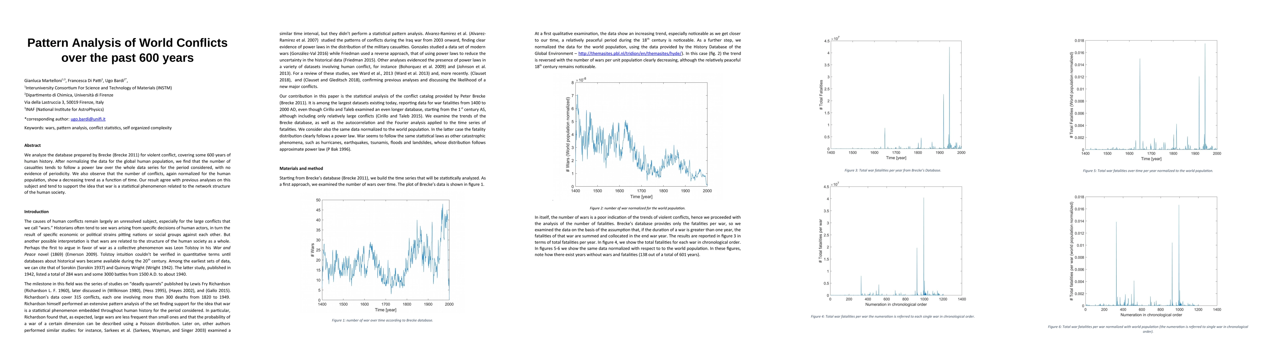 We analyze the database prepared by Brecke (Brecke 2011) for violent conflict, covering some 600 years of human history. After normalizing the data for the global human population, we find that the number of casualties tends to follow a power law over the whole data series for the period considered, with no evidence of periodicity. We also observe that the number of conflicts, again normalized for the human population, show a decreasing trend as a function of time. Our result agree with previous analyses on this subject and tend to support the idea that war is a statistical phenomenon related to the network structure of the human society.