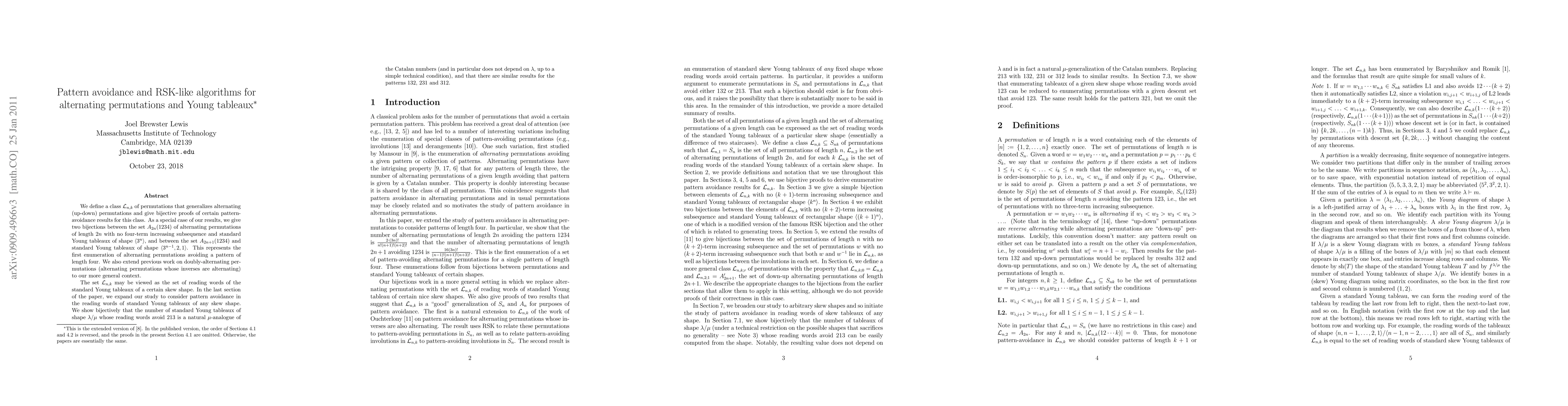 We define a class L_{n, k} of permutations that generalizes alternating (up-down) permutations and give bijective proofs of certain pattern-avoidance results for this class. As a special case of our results, we give two bijections between the set A_{2n}(1234) of alternating permutations of length 2n with no four-term increasing subsequence and standard Young tableaux of shape (3^n), and between the set A_{2n + 1}(1234) and standard Young tableaux of shape (3^{n - 1}, 2, 1). This represents the first enumeration of alternating permutations avoiding a pattern of length four. We also extend previous work on doubly-alternating permutations (alternating permutations whose inverses are alternating) to our more general context. The set L_{n, k} may be viewed as the set of reading words of the standard Young tableaux of a certain skew shape. In the last section of the paper, we expand our study to consider pattern avoidance in the reading words of standard Young tableaux of any skew shape. We show bijectively that the number of standard Young tableaux of shape lambda/mu whose reading words avoid 213 is a natural mu-analogue of the Catalan numbers (and in particular does not depend on lambda, up to a simple technical condition), and that there are similar results for the patterns 132, 231 and 312.